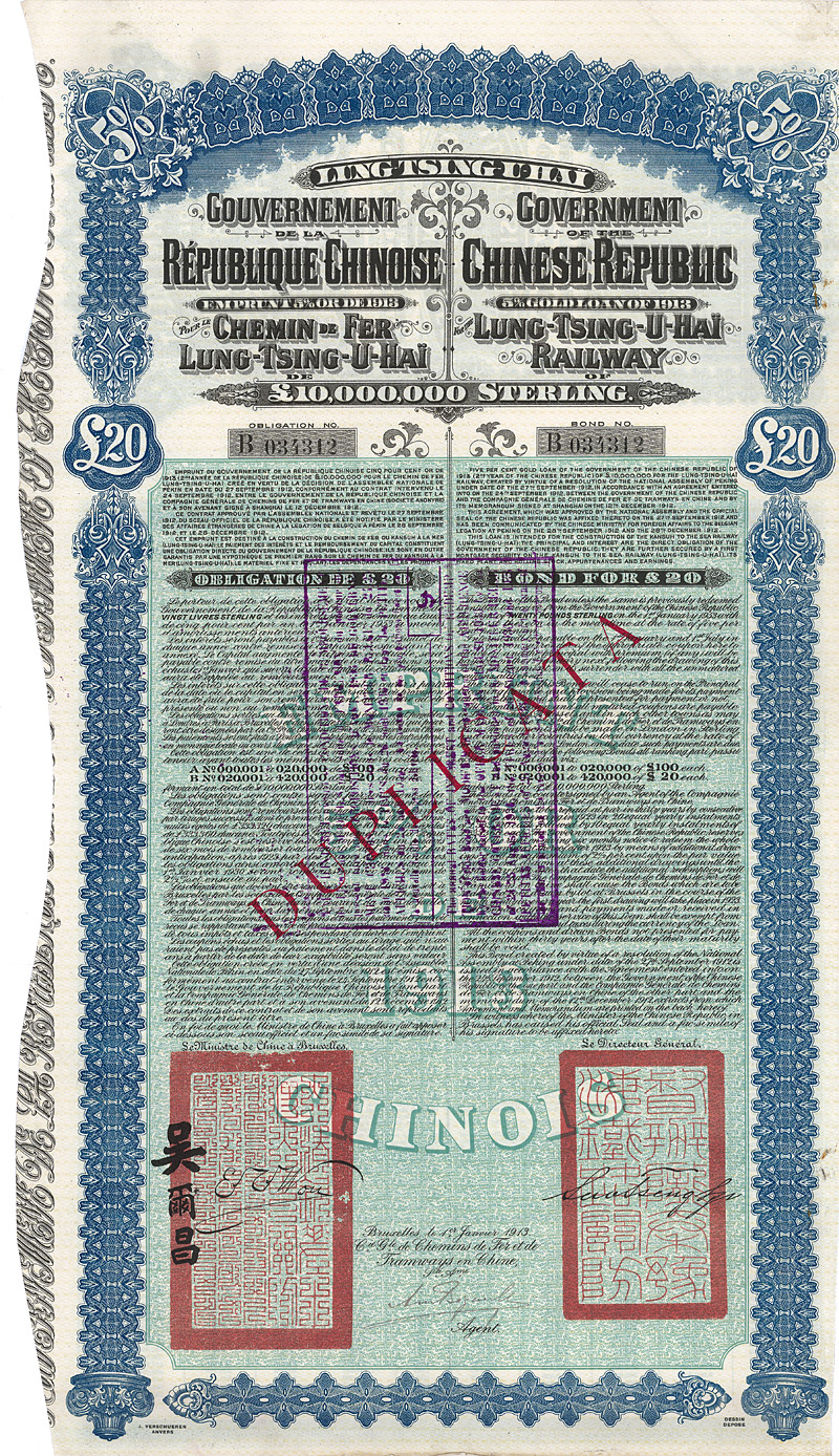 5 % Gold Bond 20 £, Nr. B34312 Brüssel, 1.1.1913 Erhaltung: EF Auflage 52, Kuhlmann 281 DP. Mit Stempel „DUPLICATA“ (auch die Kupons). Übergroßes Format, dreisprachig französisch/englisch/chinesisch. Maße: 50,5 x 28,5 cm. Mit beiliegendem restlichen Kuponbogen (Kupons 84-124, ebenfalls abgestempelt „DUPLICATA“). Rarität. Nicht entwertet!