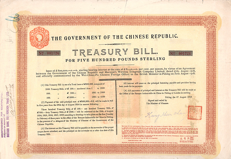 8 % Treasury Bill 100 £, Nr. 345 Peking, 27.8.1918 Erhaltung: VF Auflage 1.500, Kuhlmann 430, D/H CA 136a, R10. Teil einer Anleihe in Höhe von 600.000 £ für den Ausbau des Telegrafennetzes. Ausgegeben aufgrund eines Abkommens zwischen der Regierung der Chinesischen Republik und Marconi’s Wireless Telegraph Co. Ltd. vom 27.8.1918, veröffentlicht durch Wai-Chiao-Pu (Chinese Foreign Office) für den Britischen Minister in Peking am 30.8.1918. Beginnend am 28.8.1924 innerhalb von 5 Jahren. 1936 so geändert, dass sie Hauptrückzahlung 1941 beginnen und 1975 beendet sein sollte. Maße: 26,5 x 38,3 cm. Mit neuen Kupons 6-78. Nicht entwertet! Nr. 103 Schätzpreis: 650,00 EUR Startpreis: 250,00 EUR