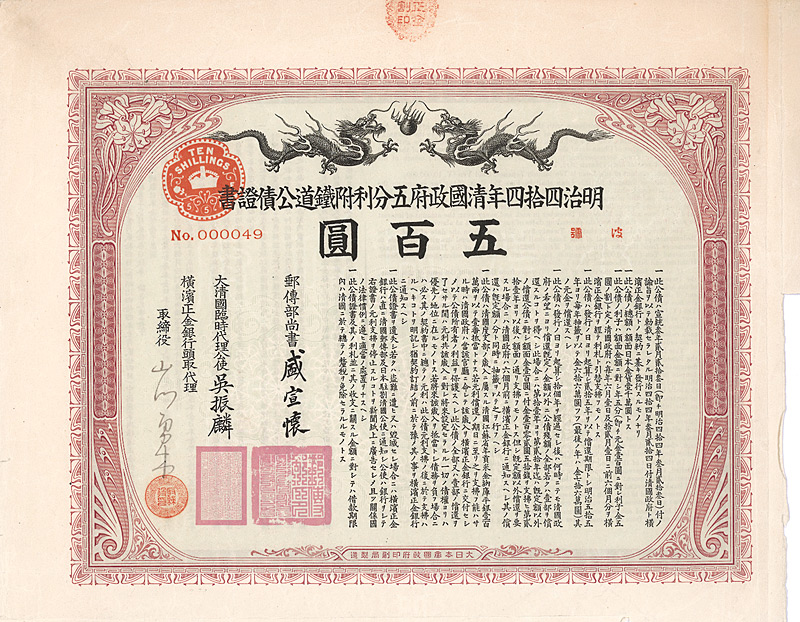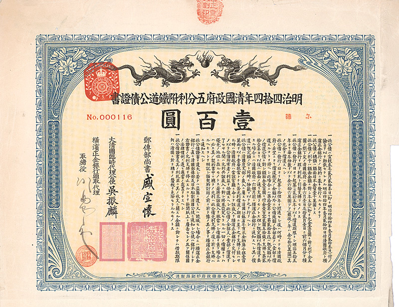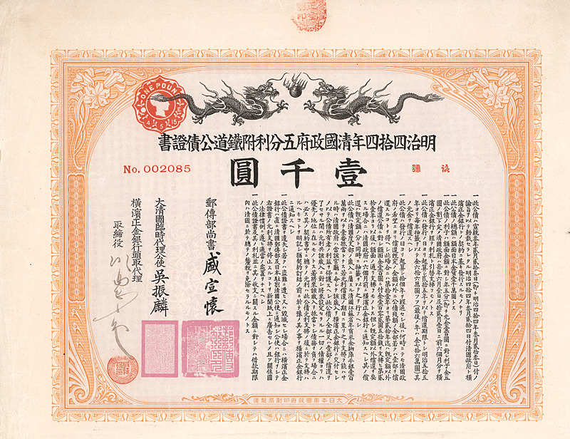 Kuhlmann 210. In Japan aufgenommene Anleihe von 10 Millionen Yen unter Garantie der chinesischen Regierung für die Peking-Hankow-Eisenbahn. Anleihentext rückseitig auch englisch. Schöne Gestaltung mit zwei Drachen. Maße: 22 x 27 cm. Mit anhängenden restlichen Kupons 37-50. Nicht entwertet!