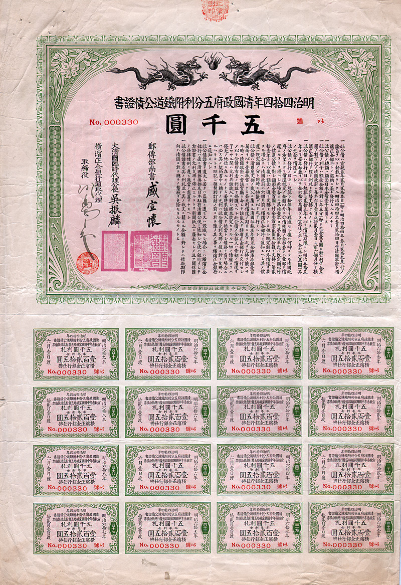5 % Gold Loan 5.000 Yen, Nr. 330 von 1911 Erhaltung: EF/VF Kuhlmann 213. In Japan aufgenommene Anleihe von 10 Mio. Yen unter Garantie der chinesischen Regierung für die Peking-Hankow-Eisenbahn. Schöne Gestaltung mit zwei Drachen. Maße: 22 x 27 cm. Mit anh. restlichen Kupons 25-50. Nicht entwertet! Nr. 112 Schätzpreis: 150,00 EUR Startpreis: 50,00 EUR