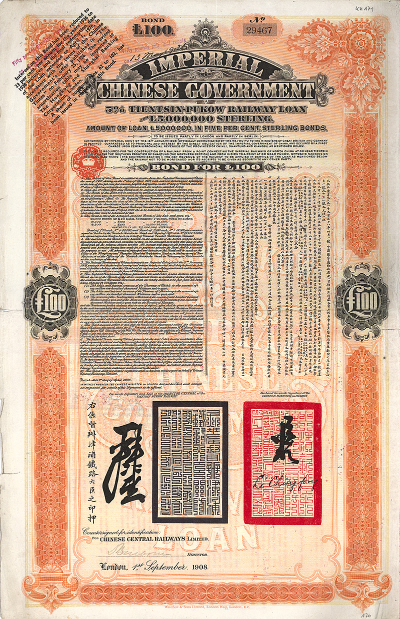 Imperial Chinese Government - 5 % Tientsin-Pukow Railway Loan