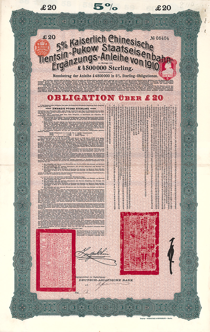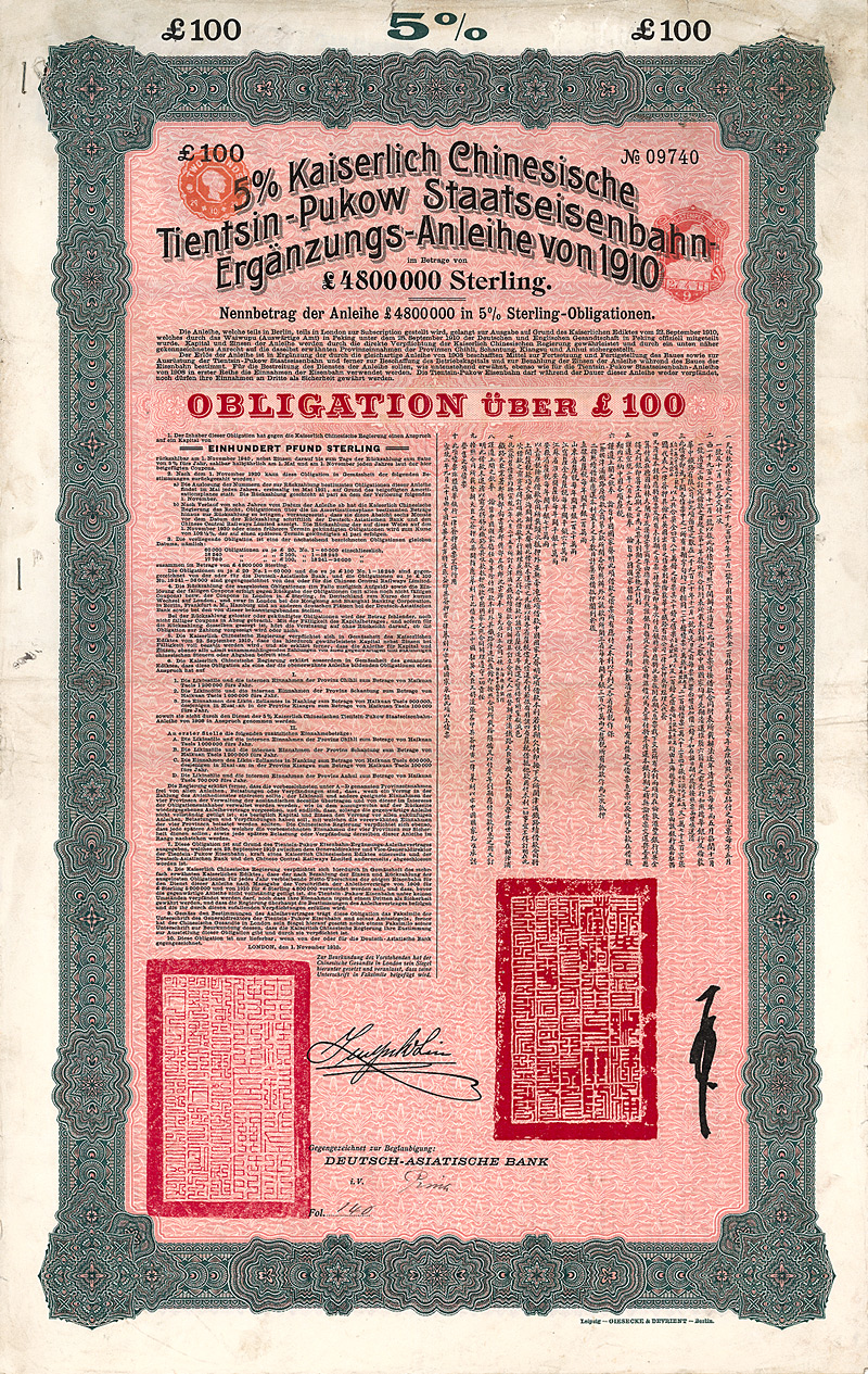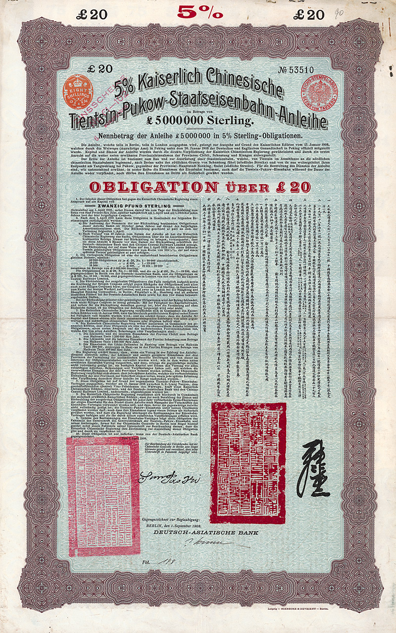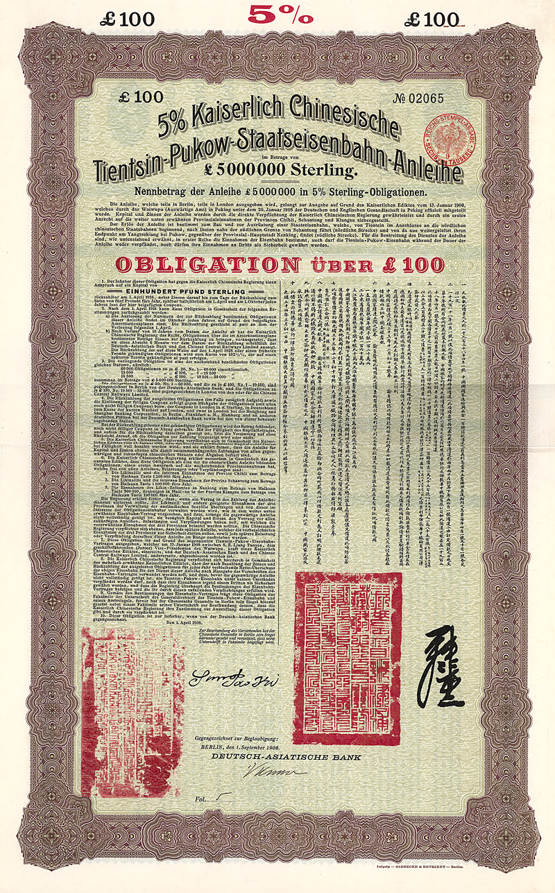 5 % Obligation 100 £, Nr. 3114 1.11.1910 Erhaltung: EF/VF Kuhlmann 202, Auflage 9.000, D/H CA 116b, R5. Die Tientsin-Pukow-Eisenbahn verband die Bahnen in Nordchina mit dem Shanghai-Nanking-System. Der nördliche Teil mit Anschluß auch an die deutsche Schantung-Eisenbahn wurde von deutschen Generalunternehmern gebaut. Für den südlichen Teil bis Pukow am Yang-Tze-Kiang zeichneten britische Kontraktoren verantwortlich. Gegengezeichnet von der Deutsch-Asiatischen Bank. Ausgegeben zum Bau der Bahnstrecken von Tientsin nach Ihsien in der Nähe der südlichen Grenze von Shantung und von Ihsien nach Pukow am Yangtsze-Kiang. Übergroßer, mehrfarbiger Druck von G & D, zweisprachig deutsch/chinesisch. Maße: 54,2 x 34,2 cm. Mit restlichem Kuponbogen (Kupons 56-60). Nicht entwertet! Nr. 127 Schätzpreis: 120,00 EUR Startpreis: 60,00 EUR