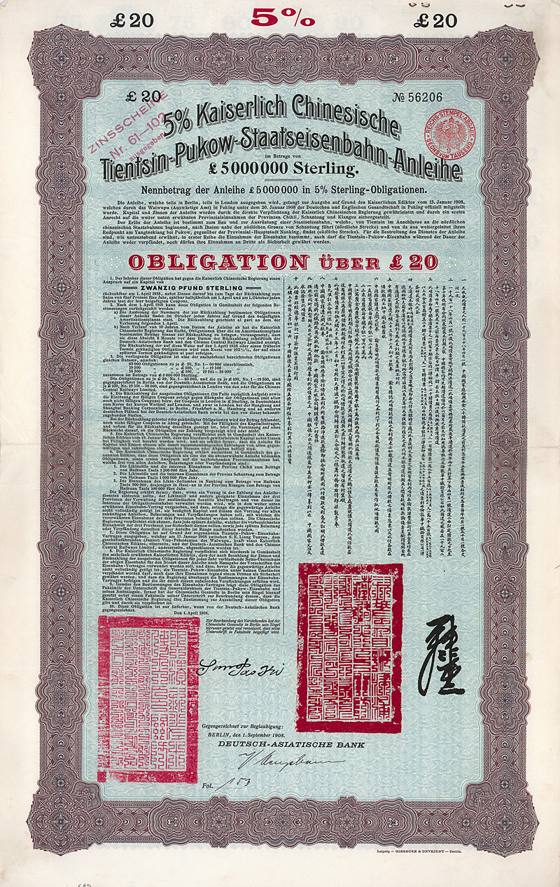 5 % Obligation 20 £, Nr. 56206 1.4.1908 Erhaltung: EF/VF DAB, Kuhlmann 172 OC. Mit den Kupons 61-102 + Talon. Gegengezeichnet durch die Deutsch-Asiatische Bank. Überformatiger Druck von G & D, große chinesische Siegel, zweisprachig deutsch/chinesisch. Maße: 54,.5 x 34,4 cm. In dieser guten Erhaltung sonst nicht zu bekommen! Nicht entwertet!
