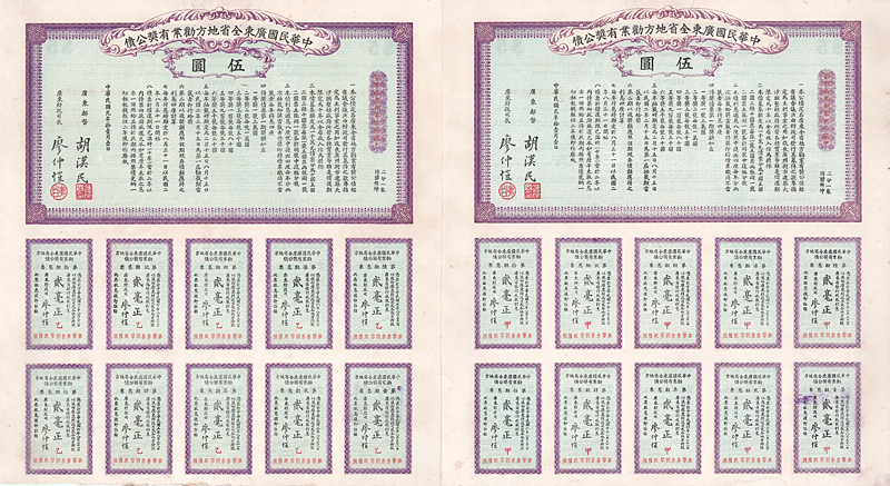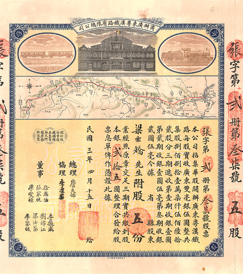 Share 5 x 5 Yuan 15.4.1914 Erhaltung: VF Die bedeutende Bahn wurde gebaut von dem Ingenieur Jeme Tien Yor, der auch die Kaiserliche Eisenbahn Peking-Kalgan (Beijing-Zhangjiakou) baute. Die Strecke der Kanton-Hankow-Eisenbahn führte über den Süden von Hankow (Wuhan) nach Chochow und dann an der Küste entlang von Lochang nach Kanton. Der Verkehr von Kanton nach Hankow und umgekehrt erfolgte bis Shanghai auf dem Seeweg und dann mit der Eisenbahn. 1936 wurde die Eisenbahnstrecke dann fertiggestellt. Sie ermöglichte erstmals den schnellen Transit zwischen Peking und Kanton (Guangzhou), indem der Jangtsekiang überquert wurde. Sehr dekorativ gestaltetes Papier mit zwei Eisenbahn-Vignetten, dazwischen ein prachtvoller Bahnhof, darunter große Karte mit Streckenverlauf. Mit gedruckter Signatur von Jeme Tien Yor. Aktientext nur chinesisch, allerdings auf dem Tender Firmenname auch in englisch. Maße: 33,8 x 44 cm. Kleine Einrisse hinterklebt. Rarität aus einer 20 Jahre alten Sammlung.
