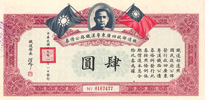 2 % Anleihe 4 Yüan, Nr. 559682 von 1930 Erhaltung: EF D/H CA 181a, R2. Die Anleihe wurde verwendet zur Vollendung der Eisenbahnstrecke Canton-Hankow. Das Porträt zeigt Dr. Sun Yat-sen, erster Präsident der Republik. Maße: 13 x 26,7 cm. Mit anh. restlichen Kupons. Nicht entwertet! Nr. 134 Schätzpreis: 100,00 EUR Startpreis: 30,00 EUR