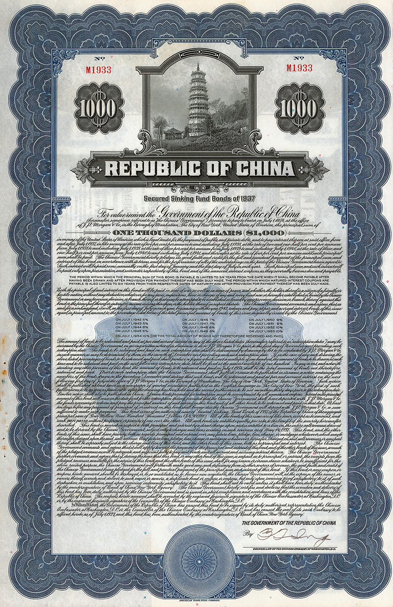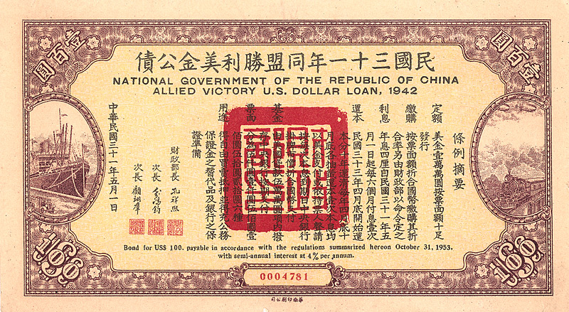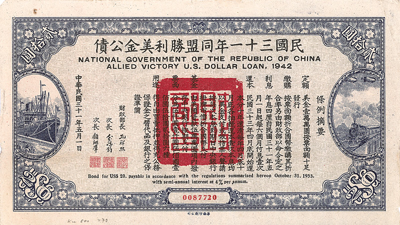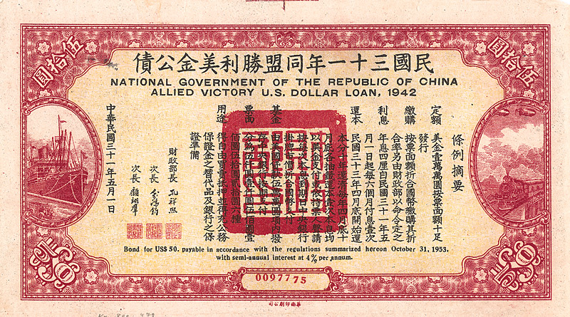 National Government of the Republic of China - Allied Victory US Dollar Loan 1942