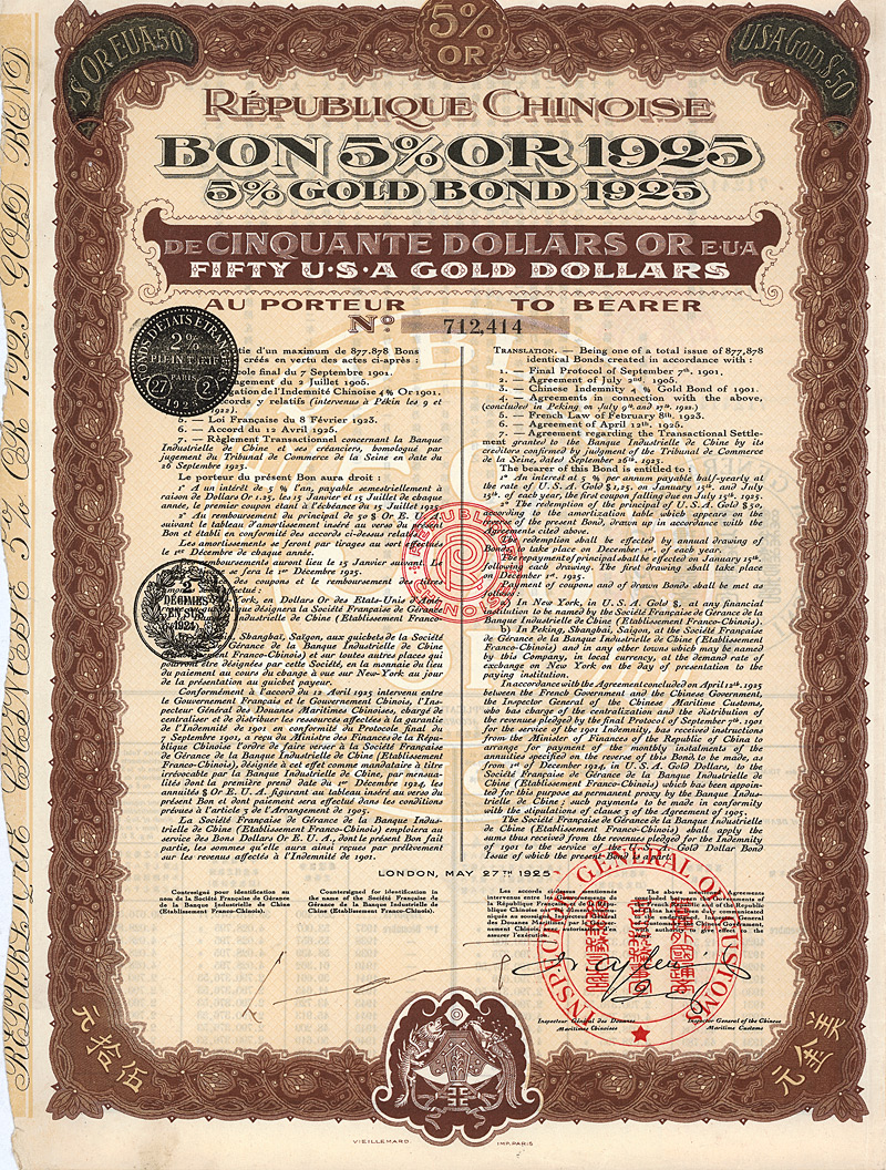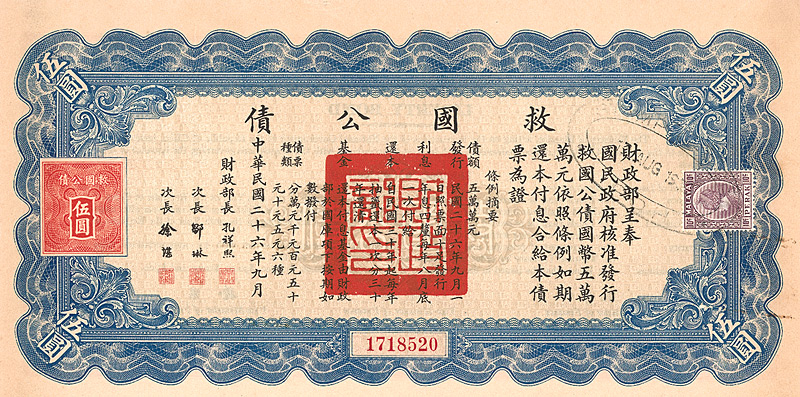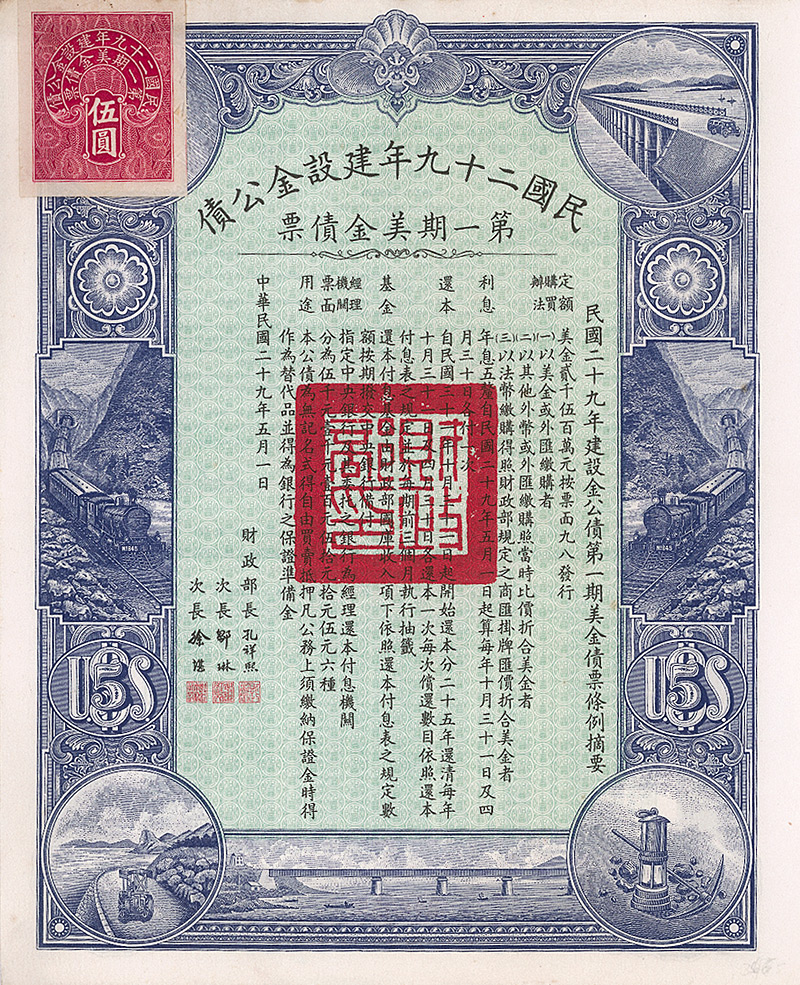 5 % Bond 5 US-$ (First Issue), Nr. 121400 1.5.1940 Erhaltung: EF Gesamtanleihe über 25 Mio. US-$. Anleihentext vorderseitig in chinesisch, rückseitig in englisch. Die hochdekorative graphische Gestaltung bringt den Anleihenzweck zum Ausdruck: Ausbau der Verkehrswege des Landes durch Eisenbahn-, Strassen- und Brückenbau. Links oben aufgeklebte Steuermarke. Maße: 23,2 x 18,8 cm. Mit restlichen Kupons 17-54. Vorderseitig mit Stempel der Bank of China. Nicht entwertet! Nr. 168 Schätzpreis: 60,00 EUR Startpreis: 20,00 EUR