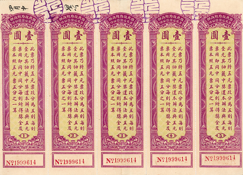 Lottery Loan 5 x 1 Yüan, Nr. 1999614 von 1931 Erhaltung: EF D/H CA 189, R2. Ausgegeben zur Finanzierung von Staatsausgaben. Es wurden jeweils 5 Ziehungen durchgeführt, bei denen 10 Preiswe zu gewinnen waren (1. Preis: 5000 Yüan). Maße: 17,8 x 24,5 cm. Nicht entwertet! Nr. 148 Schätzpreis: 40,00 EUR Startpreis: 10,00 EUR