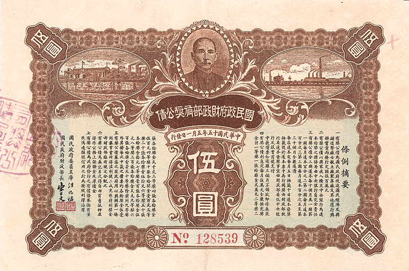 Lottery Loan 5 $, Nr. 128539 1.5.1926 Erhaltung: EF Auflage 1 Million, D/H CA 162, R2. Ausgegeben zum Ausbau der Zementindustrie, Gerbereien und anderer Unternehmen, Emissionsbetrag 5 Mio. $, Canton Währung. Da es sich um eine Lotterie-Anleihe handelte, gab es keinen festen Zinssatz. Dekoratives Papier mit Portait von Dr. Sun Yat-sen, eingerahmt von zwei Vignetten mit Industrielandschaften. Zweisprachig, vorderseitig chinesisch, rückseitig englisch. Maße: 12,5 x 18,8 cm. Nicht entwertet! Nr. 149 Schätzpreis: 40,00 EUR Startpreis: 10,00 EUR