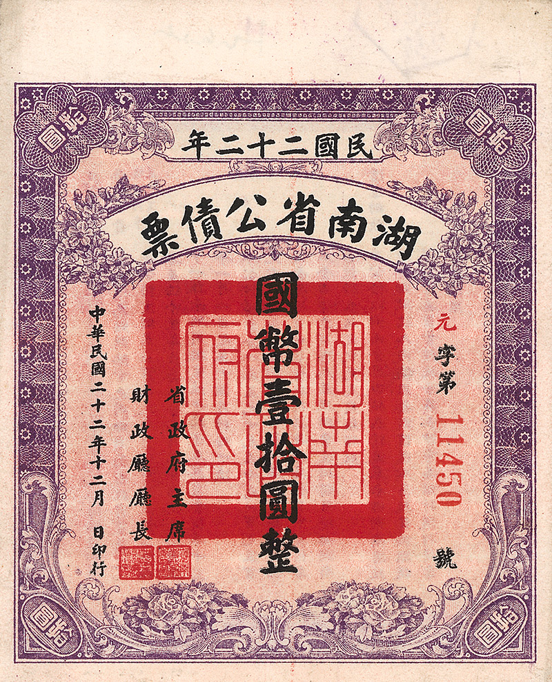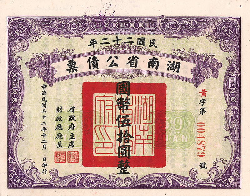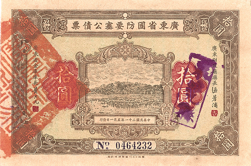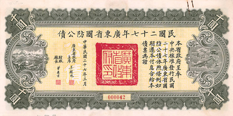 4 % Military Loan 10 Yüan, Nr. 464232 von 1933 Erhaltung: EF D/H CA 199a, R3. Emissionshöhe 30 Mio. Yüan, verwendet zur Finanzierung der Verteidigung der Provinz Kwangtung. Mittig Landschafts-Vignette. Maße: 10,7 x 15,9 cm. Nicht entwertet! Nr. 161 Schätzpreis: 60,00 EUR Startpreis: 20,00 EUR