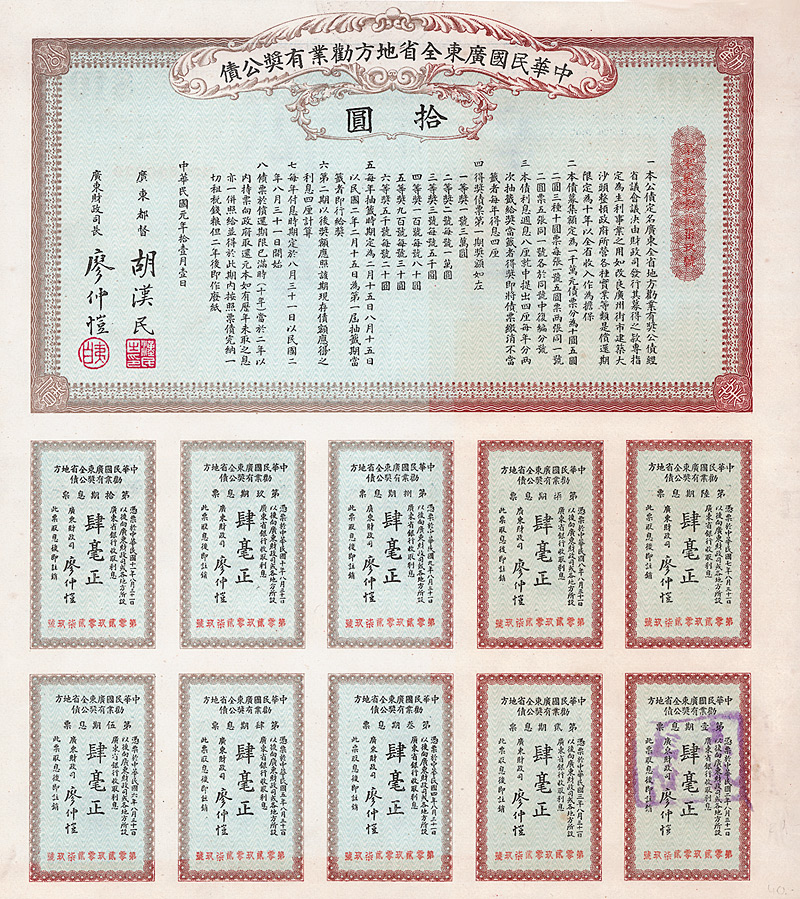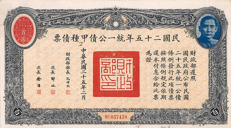 6 % Bond V. Serie 100 Yüan, Nr. 116686 Februar 1936 Erhaltung: EF Innere Staatsanleihe für die Belange der Provinz Guangdong, begeben durch das Finanzministerium. Die Anleihe arrangierte der berühmte Bankier Kung Kung Xiangxi (K‘ung Hsiang-hsi, genannt H.H. Kung), der reichste Mann in China, zu dieser Zeit Finanzminister. Dekorativ, rechts mit Porträt von Dr. Sun Yat-Sen. Auch die anhängenden restlichen Kupons mit seinem Konterfei. Maße: 12,7 x 27,3 cm. Mit anh. restlichen Kupons. Nicht entwertet! Nr. 183 Schätzpreis: 175,00 EUR Startpreis: 50,00 EUR