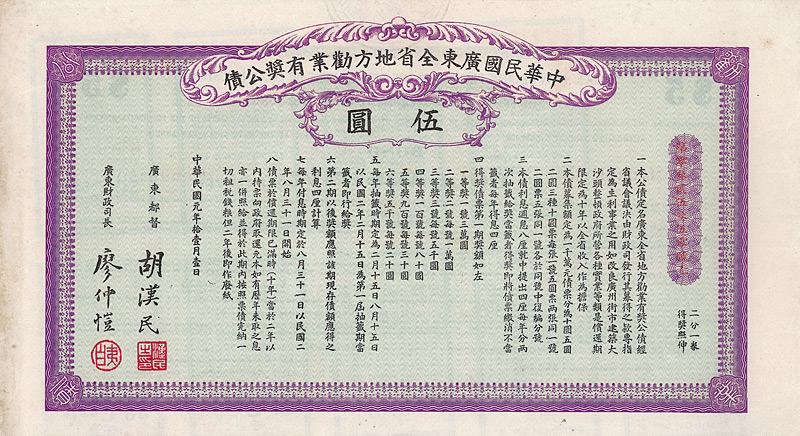 Lottery Loan 5 $, Nr. 1344620 1.8.1926 Erhaltung: UNC/EF Auflage 2 Millionen, D/H CA 163, R1. Ausgegeben zum Bau des Hafens von Whampoa, Emissionsbetrag 10 Mio. $, Canton Währung. Da es sich um eine Lotterie-Anleihe handelte, gab es keinen festen Zinssatz. Zweisprachig, vorderseitig chinesisch, rückseitig englisch. Maße: 12,5 x 18,6 cm. Nicht entwertet! Nr. 189 Schätzpreis: 200,00 EUR Startpreis: 75,00 EUR