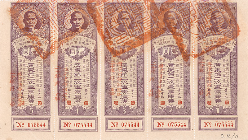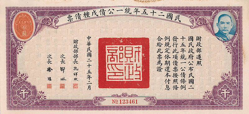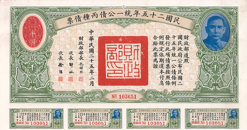Bond 1.000 Yüan, Nr. 123461 Februar 1936 Erhaltung: EF Umrandung in dunkelviolett. Dekorativ, rechts mit Porträt von Dr. Sun Yat-Sen. Auch die anhängenden restlichen Kupons mit seinem Konterfei. Maße: 12,5 x 27,2 cm. Mit anh. restlichen Kupons 11-48. Nicht entwertet! Nr. 184 Schätzpreis: 80,00 EUR Startpreis: 20,00 EUR