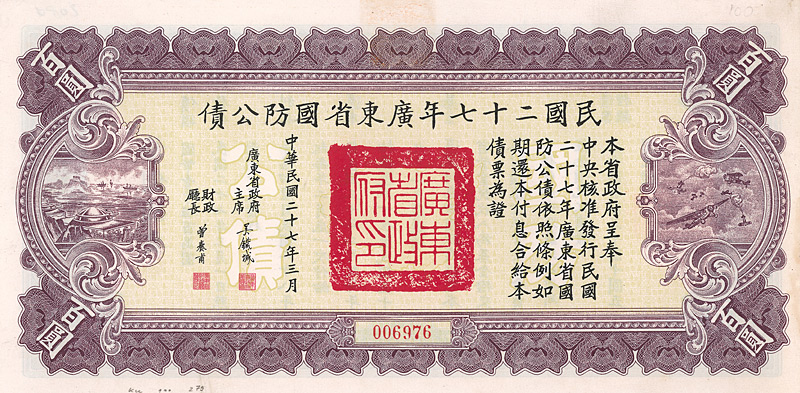 4 % Military Loan 100 Yüan, Nr. 6976 März 1938 Erhaltung: EF D/H CA 208d, R4. Emissionshöhe 15 Mio. Yüan, verwendet zur Finanzierung der Verteidigung der Provinz Kwangtung. Zwei Vignetten, links Kanonenbunker an der Küste des Südchinesischen Meeres, rechts Luftkampf. Maße: 13,3 x 26,6 cm. Mit anh. restlichen Kupons 3-32. Nicht entwertet! Nr. 162 Schätzpreis: 600,00 EUR Startpreis: 250,00 EUR