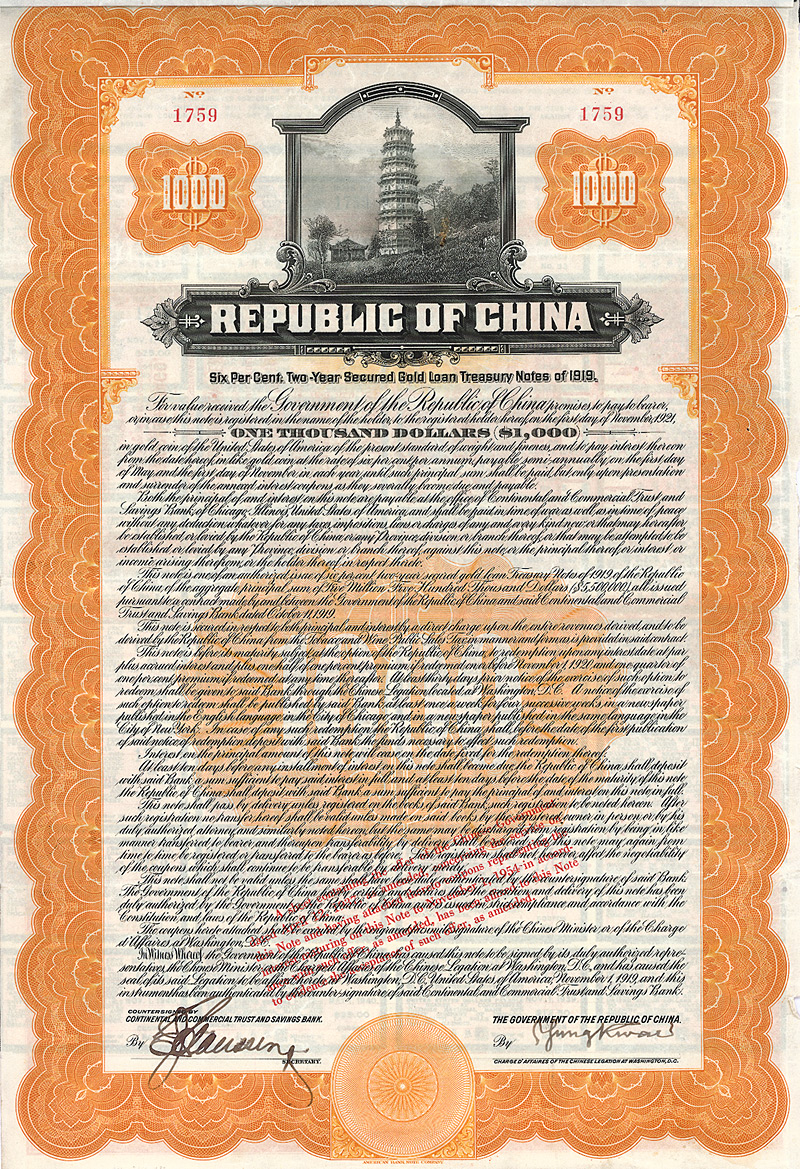 6 % Gold Bond 1.000 $, Nr. 1759 1.11.1919 Erhaltung: VF Auflage 5.500, Kuhlmann 530. Laufzeit bis 1921, 1937 verlängert. Ausstehend noch 1695 Stücke. Aufgelegt durch die Continental and Commercial Trust and Savings Bank, abgesichert durch die Tabak- und Weinsteuer. ABNC-Stahlstich mit einer Pagode. Maße: 37,8 x 25,4 cm. Mit anh. neuen Kupons 4-35 und mit komplettem Scrip-Bogen (14 Zertifikate mit verschiedenen Nennwerten, Kuhlmann 530 SCRIP). Nicht entwertet! Nr. 165 Schätzpreis: 650,00 EUR Startpreis: 250,00 EUR