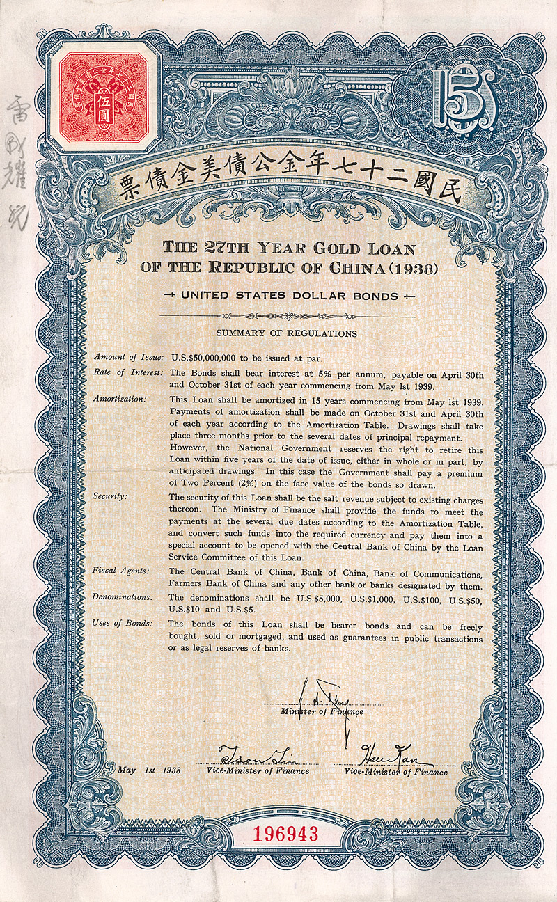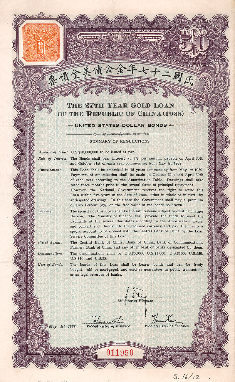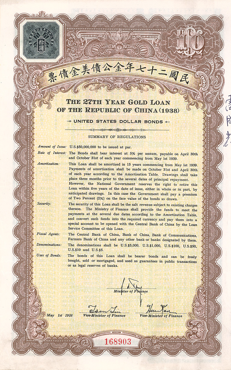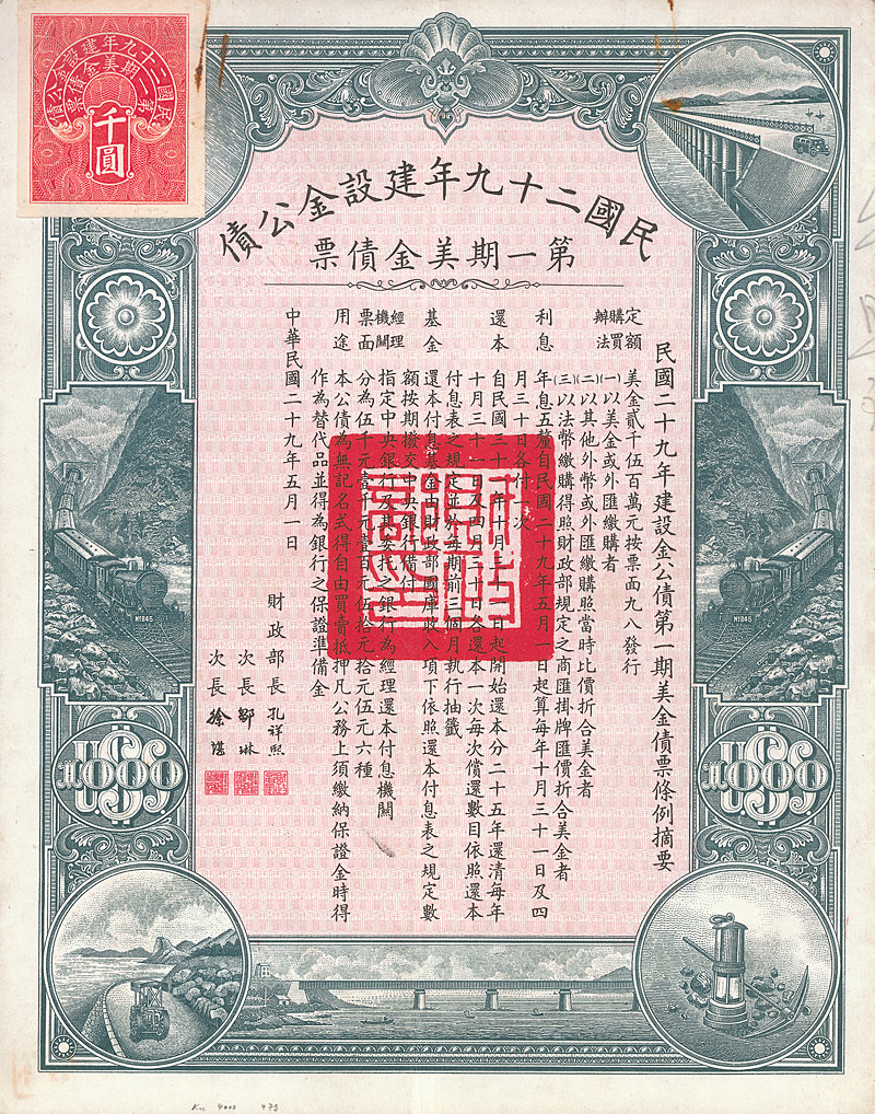 5 % Bond 1000 US-$, Nr. 3635 1.5.1940 Erhaltung: VF+ Gesamtanleihe über 25 Mio. US-$. Anleihentext vorderseitig in chinesisch, rückseitig in englisch. Die hochdekorative graphische Gestaltung bringt den Anleihenzweck zum Ausdruck: Ausbau der Verkehrswege des Landes durch Eisenbahn-, Strassen- und Brückenbau. Links oben aufgeklebte Steuermarke. Maße: 23,2 x 18,4 cm. Mit anh. restlichen Kupons 15-54. Nicht entwertet! Nr. 167 Schätzpreis: 80,00 EUR Startpreis: 30,00 EUR
