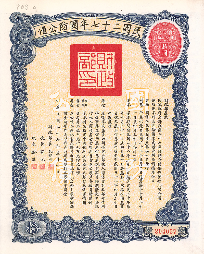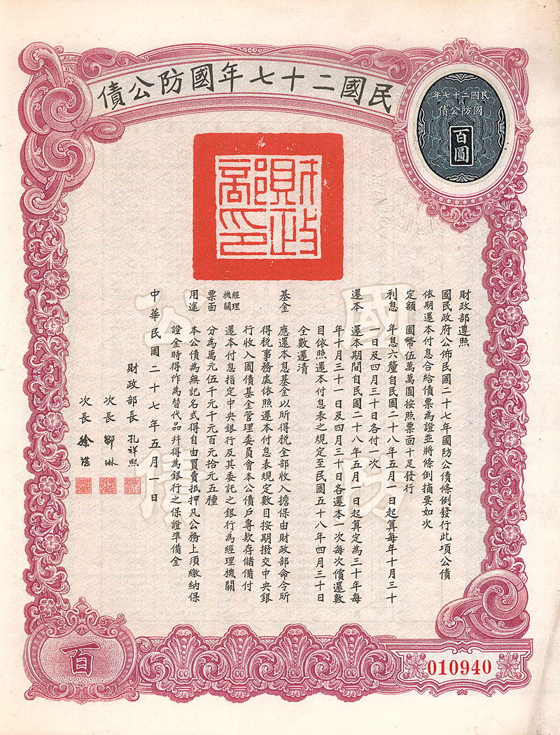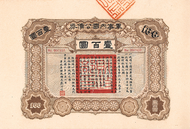 6 % Military Loan 100 Yüan, Nr. 171761 von 1938 Erhaltung: EF D/H CA 209b, R2. Teil einer Anleihe von 500 Mio. Yuan, ausgegeben zur Verteidigung Chinas, Amortisation ab 1.5.1939 innerhalb von 30 Jahren. Zahlstelle in Canton bei der Central Bank of China. Maße: 23,3 x 18,1 cm. Mit anh. restlichen Kupons 2-60. Nicht entwertet! Nr. 176 Schätzpreis: 50,00 EUR Startpreis: 20,00 EUR