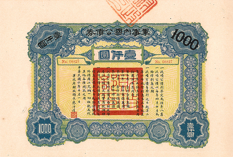 4 % Military Loan 1000 Yüan, Nr. 42 März 1938 Erhaltung: EF/VF D/H CA 208e, R6. Emissionshöhe 15 Mio. Yüan, verwendet zur Finanzierung der Verteidigung der Provinz Kwangtung. Maße: 13,3 x 26,5 cm. Mit anh. restlichen Kupons 3-32. Rechts oben kleine Roststelle von einer Büroklammer, sonst tadellose Erhaltung. Der höchste und seltenste Nominalwert dieser Anleihe! Nicht entwertet! Nr. 163 Schätzpreis: 40,00 EUR Startpreis: 15,00 EUR