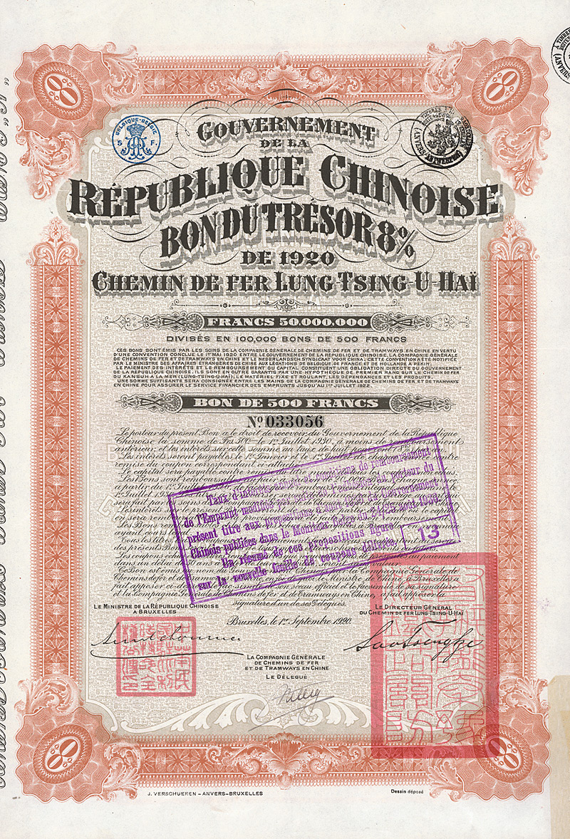 8 % Loan 20 £ = 1.200 Frs., Nr. 5372 Brüssel, 1.12.1922 Erhaltung: EF/VF Kuhlmann 640, D/H CA 148, R5. In Brüssel aufgelegte Anleihe für die chinesischen Staatseisenbahnen. Zweisprachig in englisch/französisch. Dekoratives Großformat mit Frontalansicht einer Dampflok. Maße: 30,5 x 50,3 cm. Mit anhängenden restlichen Kupons 6-20. Nicht entwertet! Nr. 105 Schätzpreis: 250,00 EUR Startpreis: 100,00 EUR