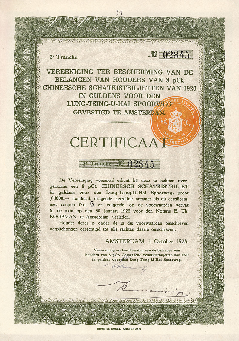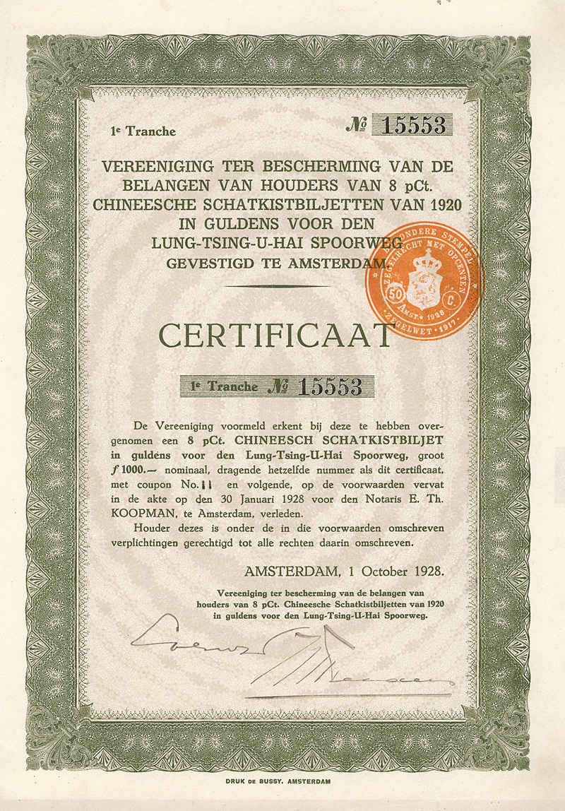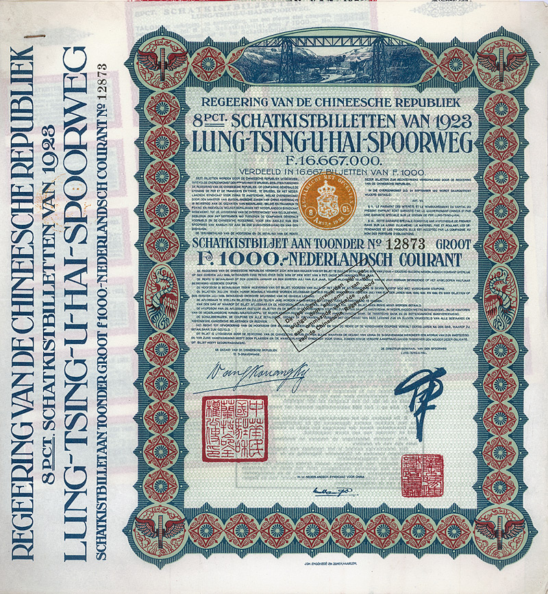 Kuhlmann 760A. 1928 hatte sich ein Kommittee gebildet, das die Interessen der holländischen Lung-Tsing-U-Hai Railway Bonds von 1920 und 1923 vertreten sollte. Maße: 27,5 x 19,5 cm. Mit anhängenden restlichen Kupons 3-10. Nicht entwertet!