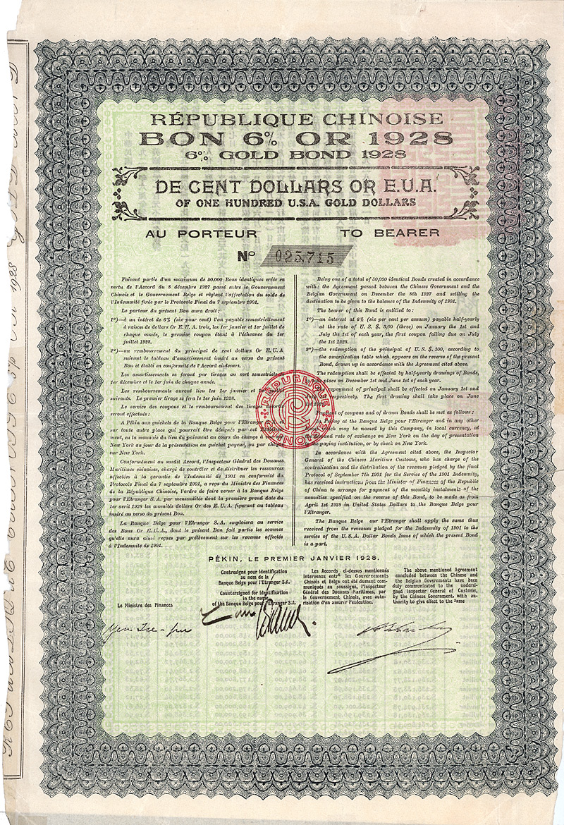 6 % Belgian Boxer Indemnity 100 Gold $, Nr. 25716 Peking, 1.1.1928 Erhaltung: VF Kuhlmann 750. Gesamtanleihe über 5 Mio. Gold $, davon 2 Mio. für Eisenbahnmaterial in Belgien für die LTUH-Linie, 1,75 Millionen für andere Strecken, 1,25 Mio. für Erziehungs- und philantropische Einrichtungen in China. Gedruckt in französisch/englisch und chinesisch. Maße: 36 x 24,5 cm. Mit anh. restlichen Kupons 23-26 (Kupon #23 wurde mit Tesafilm angeklebt, was zur einen Verfärbung am rechten Rand führte). Nicht entwertet! Nr. 188 Schätzpreis: 35,00 EUR Startpreis: 10,00 EUR