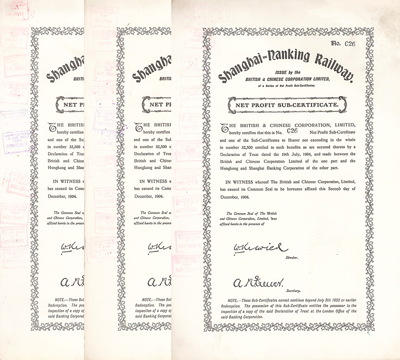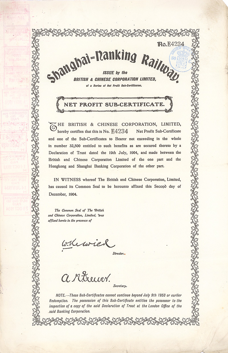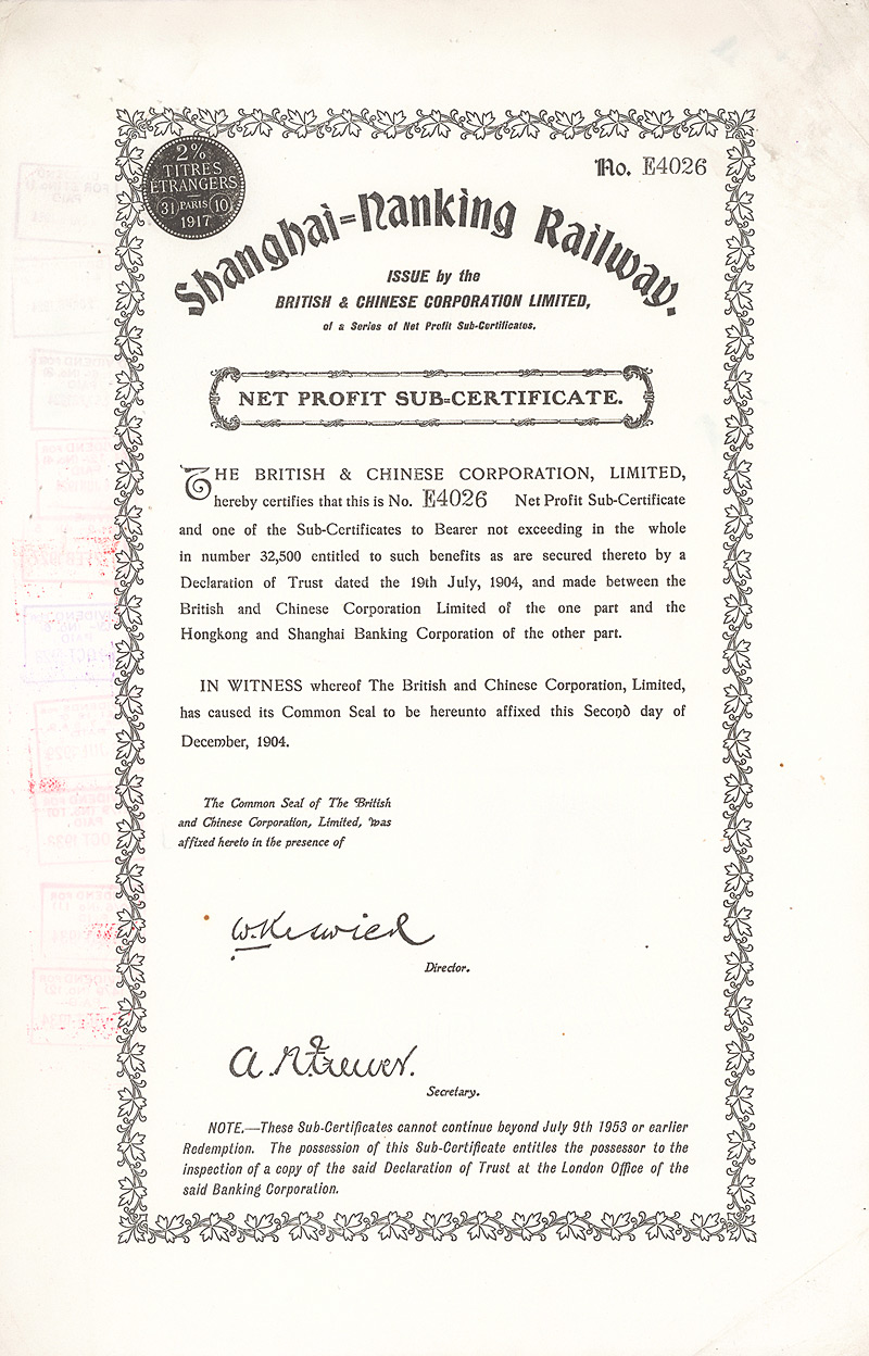 Net Profit Sub-Certificate, Nr. E4026 London, 2.12.1904 Erhaltung: EF/VF Kuhlmann 119 E, D/H CA 111, R2. Faksimilesignatur William Keswick. Maße: 38,6 x 25,4 cm. Mit französischem Steuerstempel. Nicht entwertet! Nr. 194 Schätzpreis: 150,00 EUR Startpreis: 50,00 EUR Shanghai-Nanking Railway (5 Stücke)
