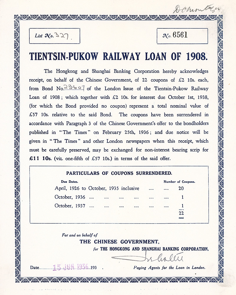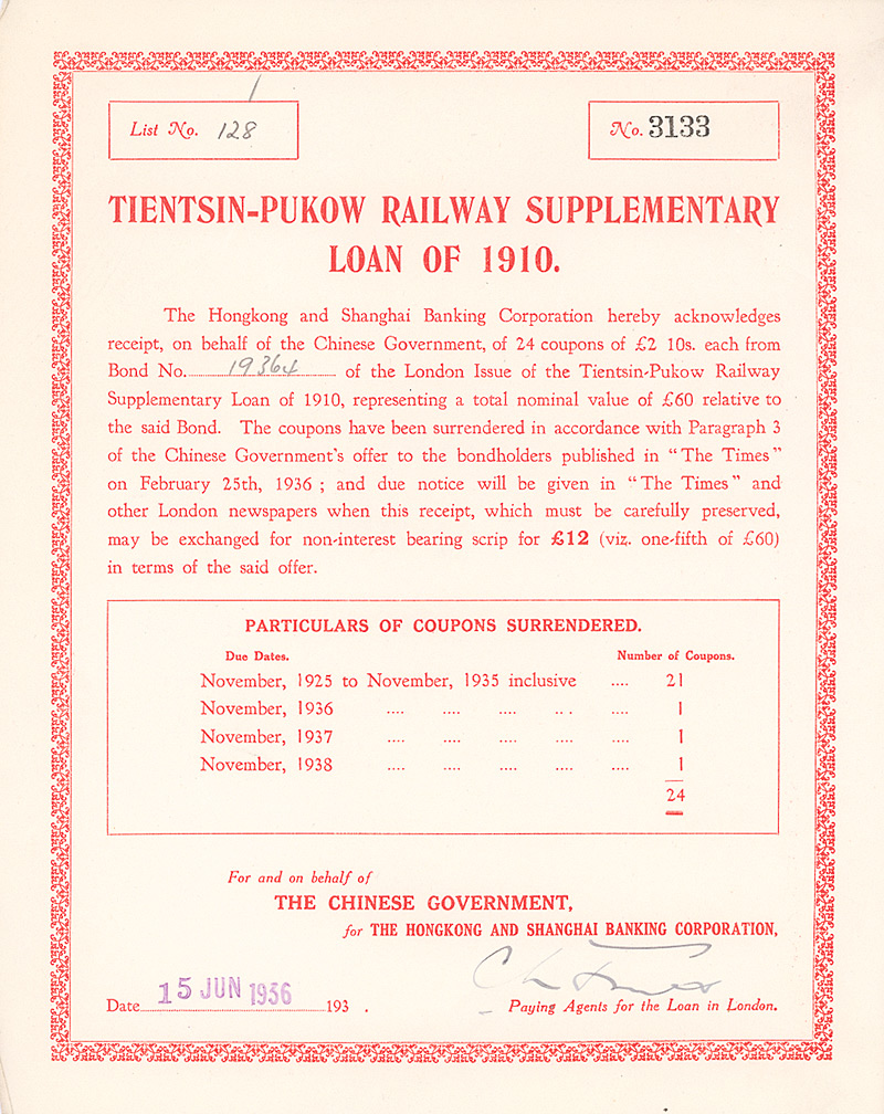 Receipt 11.10 £, Nr. 6561 15.6.1936 Erhaltung: EF Kuhlmann 170 SCRIP TE TPS 11. Die Tientsin-Pukow-Eisenbahn verband die Bahnen in Nordchina mit dem Shanghai-Nanking-System. Der nördliche Teil mit Anschluß auch an die deutsche Schantung-Eisenbahn wurde von deutschen Generalunternehmern gebaut. Für den südlichen Teil bis Pukow am Yang-Tze-Kiang zeichneten britische Kontraktoren verantwortlich. Gegengezeichnet durch die Honkong and Shanghai Banking Corp. Maße: 25,3 x 20,2 cm. Nicht entwertet! Nr. 196 Schätzpreis: 40,00 EUR Startpreis: 10,00 EUR