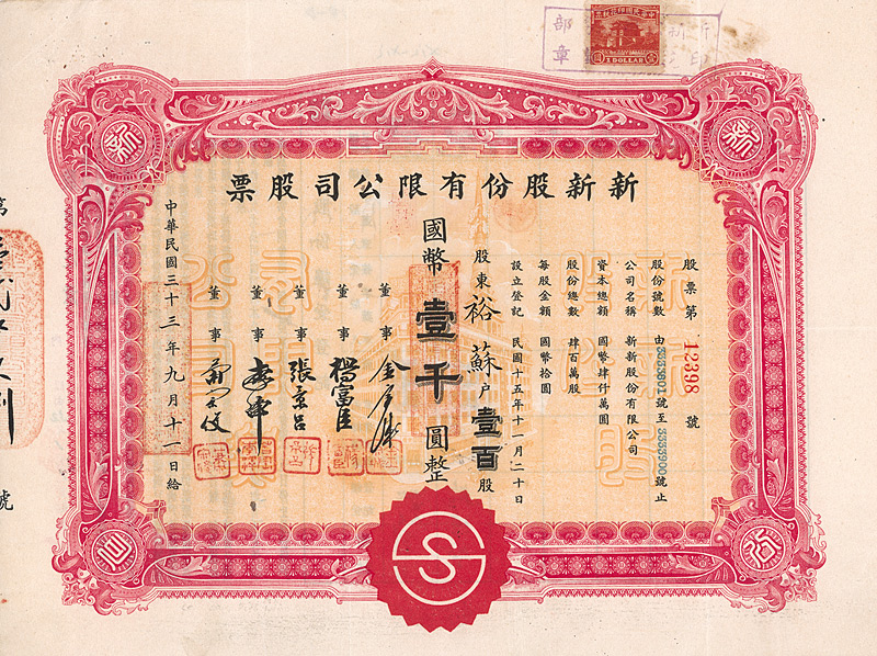 Das berühmte 1926 gegründete Kaufhaus im Herzen von Shanghai unterhielt sogar ein eigenes Rundfunkstudio mit Starsängern. Aktientext nur chinesisch. Dekoratives Papier mit Unterdruckabbildung des Kaufhauses. Maße: 20,9 x 27,5 cm. Mit anhängenden restlichen Kupons. Im Drumm/Henseler-Katalog erscheint diese Aktie unter der Nr. CA 306 als „Sun Sun Co. Ltd.“, Shanghai, 1000 Yüan, ausgegeben 1943. Was ist richtig? Bitte um Auskunft!