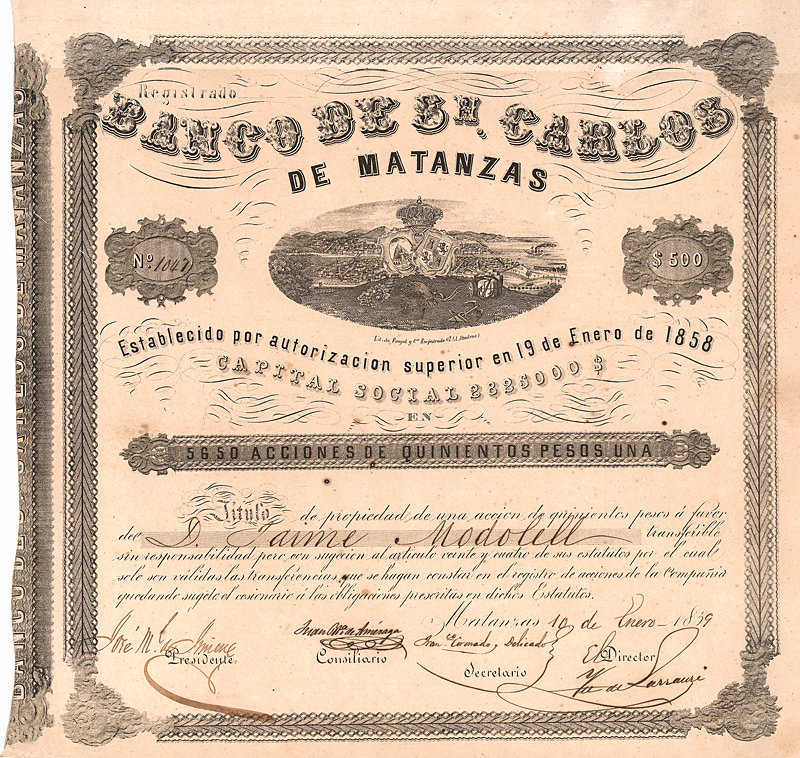 Accion 500 Pesos, Nr. 1046 Matanzas, 31.1.1859 Erhaltung: VF+ Gründeraktie, Auflage 5.650. Matanzas an der kubanischen Nordküste war damals nach dem 84 km westlicher gelegenen Habana die zweitwichtigste Stadt der Insel. Sie liegt äußerst reizend, umgeben vom Hauptanbaugebiet für Zuckerrohr. Der Hafen diente vor allem der Verschiffung bedeutender Zuckerexporte nach Nordamerika. Wegen der Bedeutung der Stadt bestand hier sogar ein deutsches Konsulat. Wunderschöne Ansicht der Stadt von einem der umliegenden Hügel aus mit einem den Hafen ansteuernden Frachtdampfer und Richtung Habana fahrendem Personenzug. Lithographie, mehrere Originalsignaturen. Maße: 34,3 x 35,2 cm. Äußerst selten! |