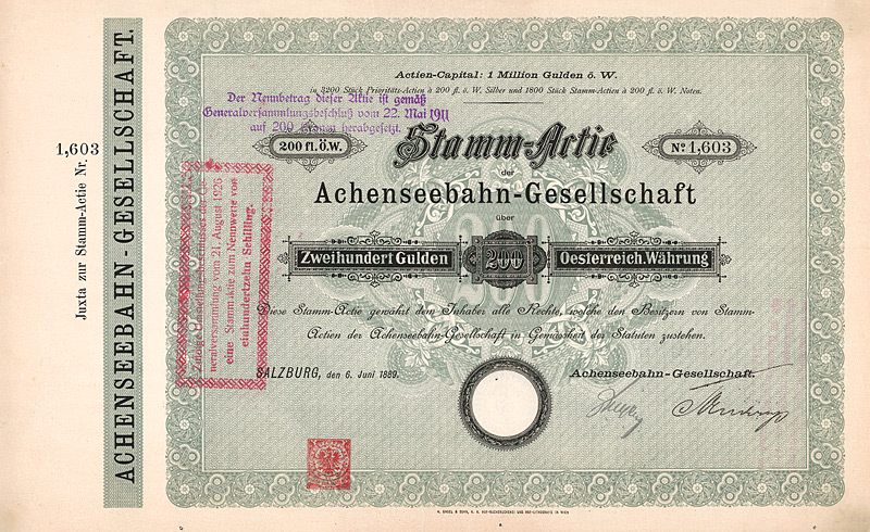 Gründeraktie, Auflage 1.800. Gründung 1889 zum Bau der meterspurigen Localbahn mit Zahnradbetrieb von Jenbach über Eben und Maurach an die Südspitze des Achensees (6,31 km), eröffnet am 8.6.1889. Die Bahn mit gemischtem Adhäsions- und Zahnschienenbetrieb ist die älteste dampfbetriebene Zahnradbahn in Europa. 1886 bewarb sich der k.k. Konsul Theodor Friedrich Freiherr von Dreifuss aus Grüneck bei Kreuth in Oberbayern um die Bahnkonzession. Zwar hatten die Anrainergemeinden große Bedenken, doch das Kloster Fiecht als Besitzer des Achensees und Betreiber der Achensee-Dampfschifffahrt befürwortete den Bahnbau. Den Bau führte die Berliner Baufirma Soenderop aus. Bei der Eröffnung am 8.6.1889 endeten die Gleise ca. 400 m vor dem Seeufer an der Anlegestelle Seespitz. Diese 400 m überbrückte das Kloster Fiecht dann mit einer Rollbahn und kassierte damit noch extra für den Transport von Stückgut und Reisegepäck zwischen Bahn und Schiff. 1916 riß die Militärverwaltung die Rollbahn weg und verlängerte die Achenseebahn bis zur Schiffsanlegestelle, doch erst 1926 wurde diese eigenmächtige Maßnahme durch eine eisenbahnrechtliche Bewilligung legalisiert. 1950 erwarb die TIWAG (Tiroler Wasserkraftwerke) die Aktienmehrheit, 1979 gingen die Aktien zu gleichen Teilen an die Gemeinden Achenkirch, Maurach und Eben, 1991 beteiligte sich auch die Gemeinde Jenbach. Heute (immer noch als Aktiengesellschaft) eine der größten Touristenattraktionen der Region. Originalunterschriften. Maße: 23,5 x 38 cm. Doppelblatt. Extrem seltenes Stück!