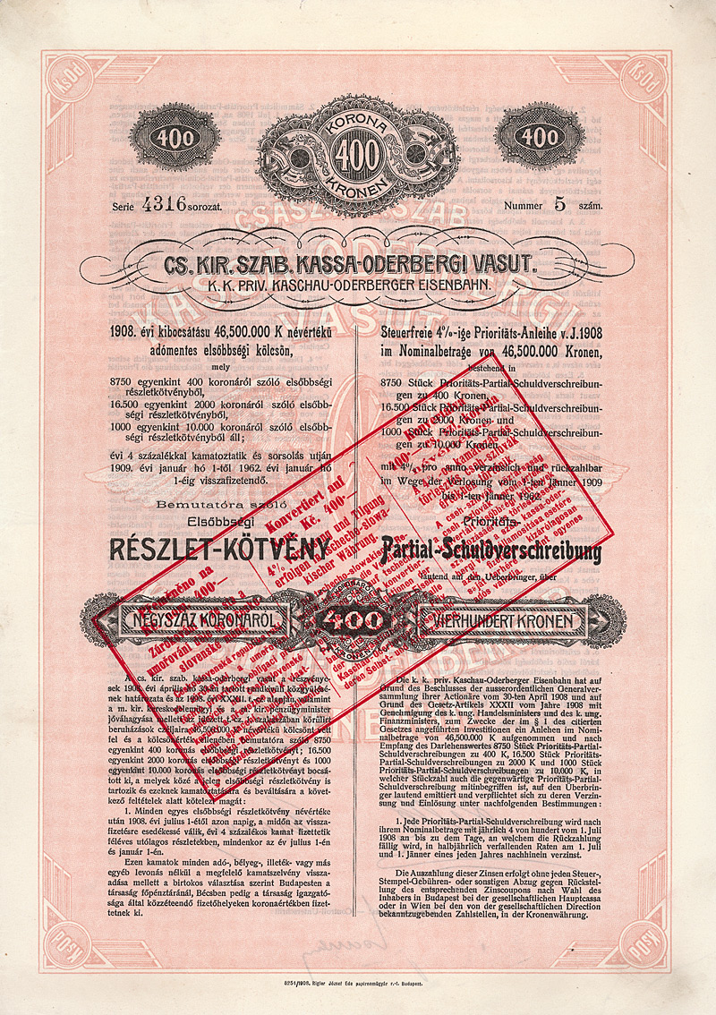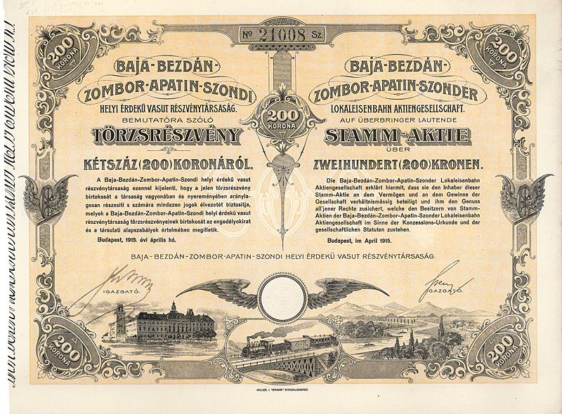 Aufage 1.000. Die Gesellschaft entstand 1913 durch Fusion der Mocsolád-Táb-Siofoker Localeisenbahn AG (74 km lange Bahn Kaposvár-Siofok, eröffnet 1906) mit der Tamesvár-Varjaser Localeisenbahn AG (29 km lange Bahn Temesvár-Varjas, eröffnet 1908). Die Strecke ist noch heute Teil der Bahnverbindung von der Hauptstadt Budapest zum Plattensee. Die Obligationen (die unter der Garantie der Kön. Ung. Staatseisenbahnen standen) notierten bis 1916 an der Budapester Börse. Sehr großes Hochformat, dreisprachig englisch/ungarisch/deutsch. Maße: 47,2 x 30,1 cm. Doppelblatt, mit Kupons.