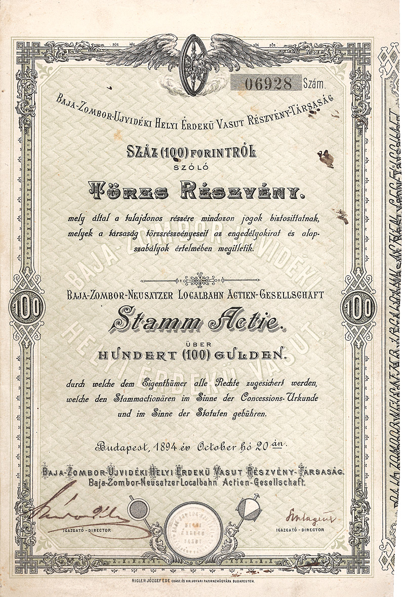 Gegründet 1894. Strecke Baja-Zombor-Neusatz, 144,977 km lang, Bahnbetrieb ab 14.9.1895. Zweisprachig ungarisch/deutsch. Herrliche dreigeteilte Vignette, geflügelte Räder. Maße: 22,5 x 38 cm. Doppelblatt, mit komplettem Kuponbogen.