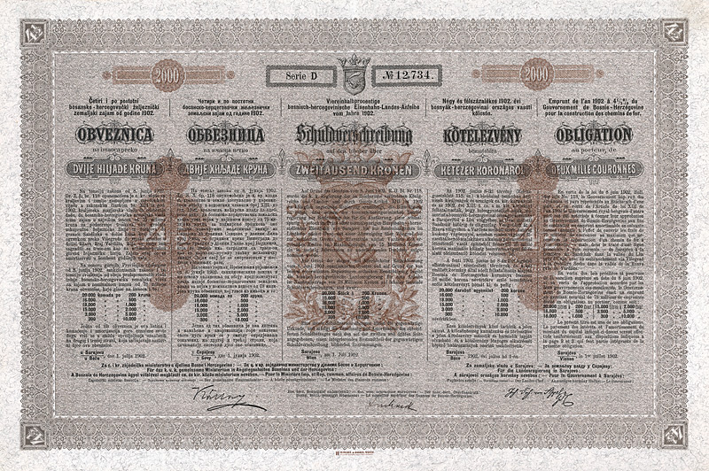 Auflage 15.000. Die Geschichte der Eisenbahnen Bosniens und Hercegovina beginnt mit ihrer im Jahr 1878 erfolgten Bestzung durch Österreich und Ungarn. Am 1.12.1878 erfolgte die Eröffnung desBetriebes auf der 56,2 km langen Strecke Banjaluka-Prijedor. Am 24.3.1879 konnte die ganze 104,31 km lange Linie bis Doberlin für den Gesamtverkehr eröffnet werden. Diese Bahnlinie wurde unter dem Namen “K.u.k. Militärbahn Banjaluka-Doberlin” der Militärverwaltung unterstellt und unmittelbar durch das Reichskriegsministerium geleitet. 1878/79 wurde auch die normalspurige Verbindungsbahn Slawon.-Brod-Bos.-Brod (3,6 km), die die Save auf einer eisernen Brücke übersetzt, gebaut. Das Schwergewicht des Eisenbahnwesens in Bosnien und Hercegovina liegt in den Schmalspurbahnen (Spurweite 76 cm). Die Geldmittel für die Errichtung dieser wurden durch Darlehen aufgebracht. Anleihe zur Bestreitung der Kosten für eine schmalspurige Hauptbahn von Sarajevo zur Sandschakgrenze im Limthafe nächst Uvac mit Abzweigung über Visegrad bis zur serbischen Grenze. Großformatiges Papier (29 x 43,8 cm), dekorativ gestaltet, fünfsprachig. Doppelblatt, inwendig Bedingungen. Mit beiliegenden Kupons. Äußerst seltenes Stück, sehr günstig angeboten!