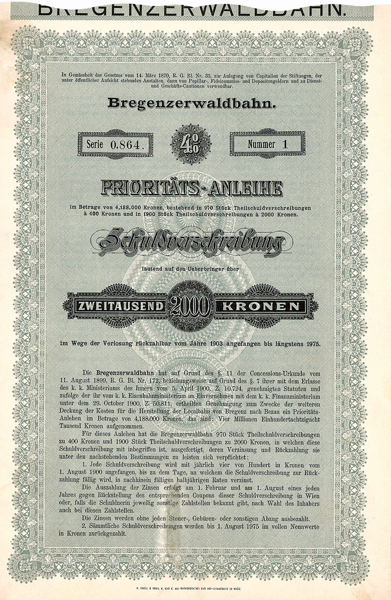 D/H OEL 1017b, Auflage 1900. R5. 760-mm-Schmalspurbahn Bregenz-Bezau (35 km). Verkehr zwischenzeitlich eingestellt und Strecke teilweise abgebaut, doch dann kamen die Eisenbahnfreunde des Verein Bregenzerwaldbahn: Heute verkehren auf dem letzten Teilstück nach Bezau wieder liebenswert restaurierte Nostalgie-Züge. Anleihe zur weiteren Deckung der Kosten für die Herstellung der Localbahn von Bregenz nach Bezau. Maße: 34,9 x 23,2 cm. Doppelblatt, mit Talon.