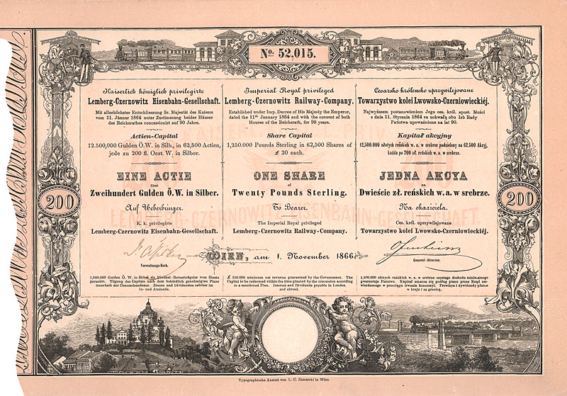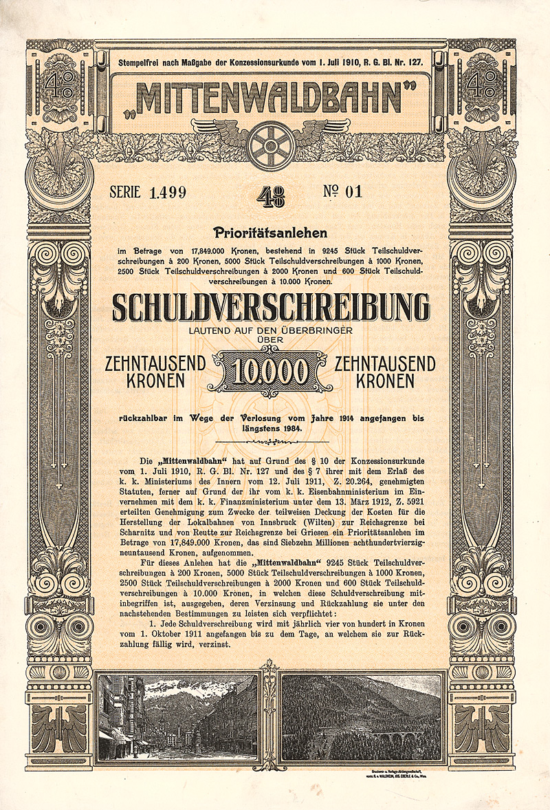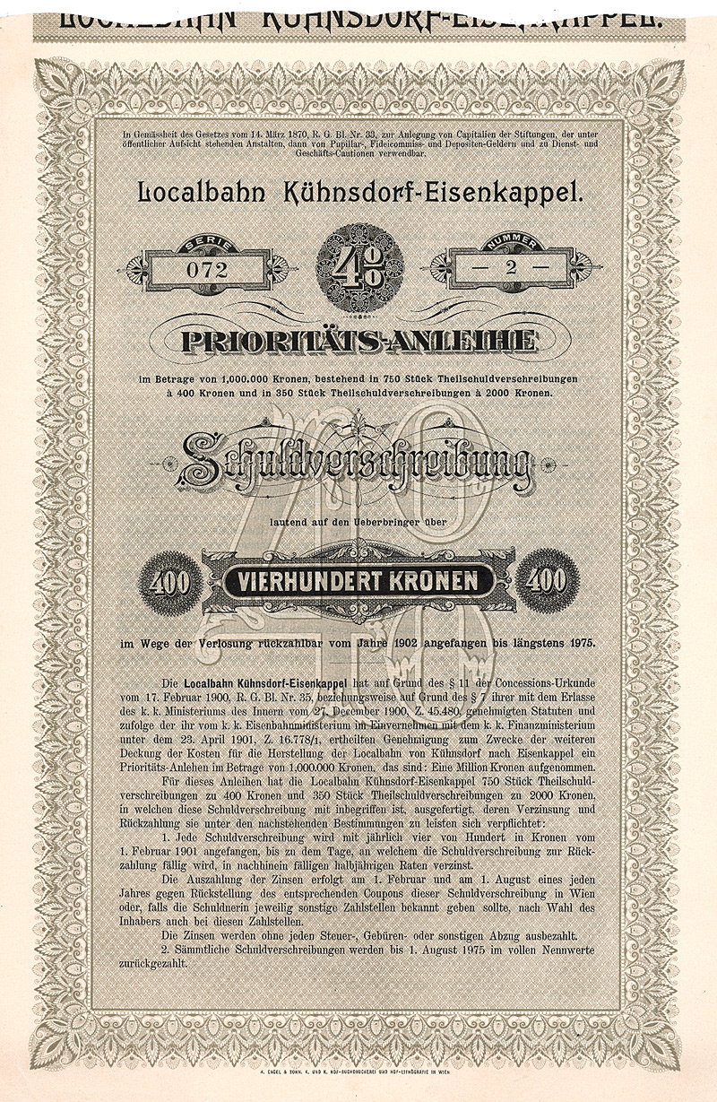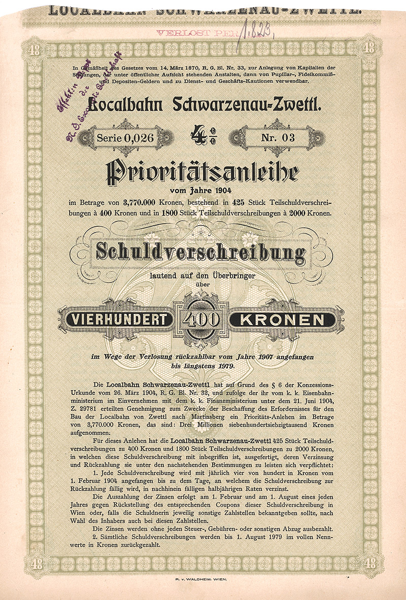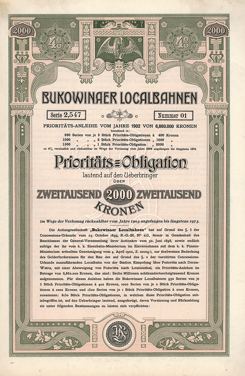 Auflage 1.500. Gründung 1883 als Localbahn Czernowitz-Nowosielitza. Der Gesellschaft gehörten zuletzt acht normal- und schmalspurige, zusammen 247 km lange Strecken in der Bukowina. Betriebsführung durch die österr. Staatsbahnen. Großaktionäre waren die Lemberg-Czernowitz-Jassy Eisenbahn, der griechisch-orientalische Religionsfond und das Land. Dekorativ, sehr schöne Jugendstil-Umrandung. Maße: 37,8 x 25,7 cm. Doppeblatt, inwendig Bedingungen + Tilgungsplan, mit beiliegendemTalon.