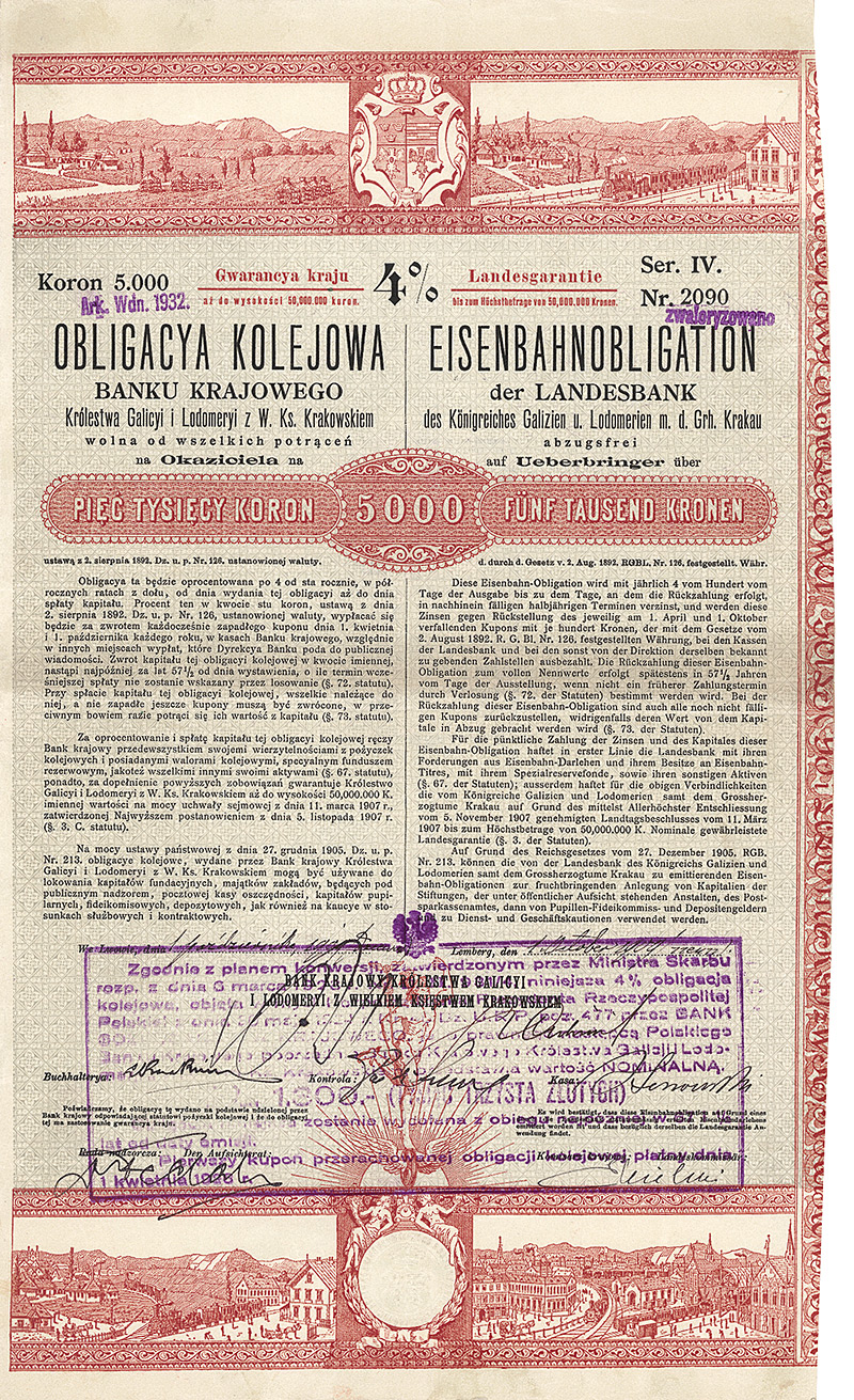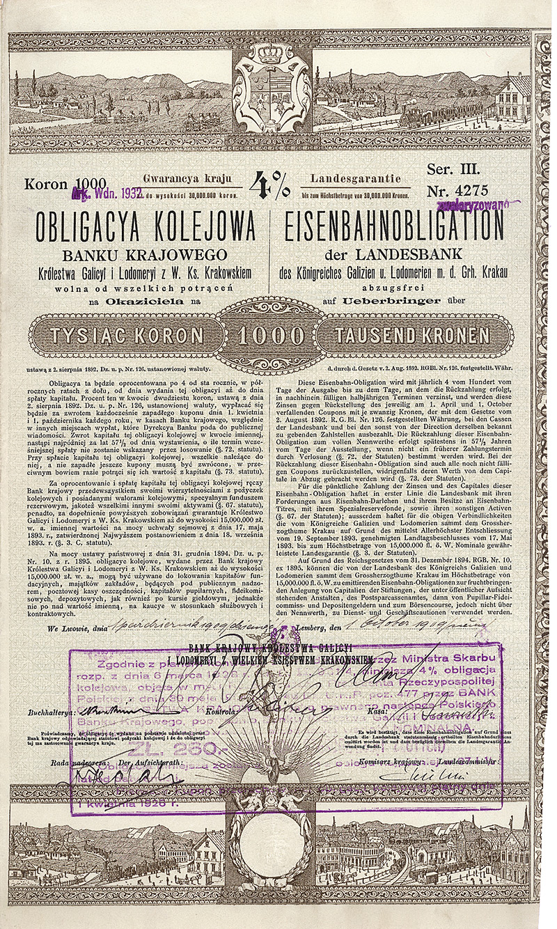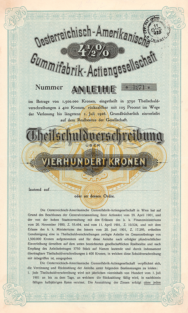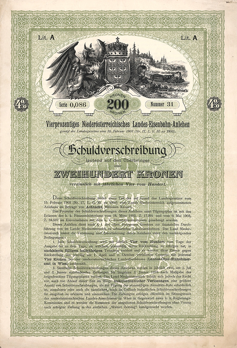 Auflage 1.500. Gründung 1883 als Localbahn Czernowitz-Nowosielitza. Der Gesellschaft gehörten zuletzt acht normal- und schmalspurige, zusammen 247 km lange Strecken in der Bukowina. Betriebsführung durch die österr. Staatsbahnen. Großaktionäre waren die Lemberg-Czernowitz-Jassy Eisenbahn, der griechisch-orientalische Religionsfond und das Land. Dekorativ, sehr schöne Jugendstil-Umrandung. Maße: 37,8 x 25,7 cm. Doppeblatt, inwendig Bedingungen + Tilgungsplan, mit beiliegendemTalon.