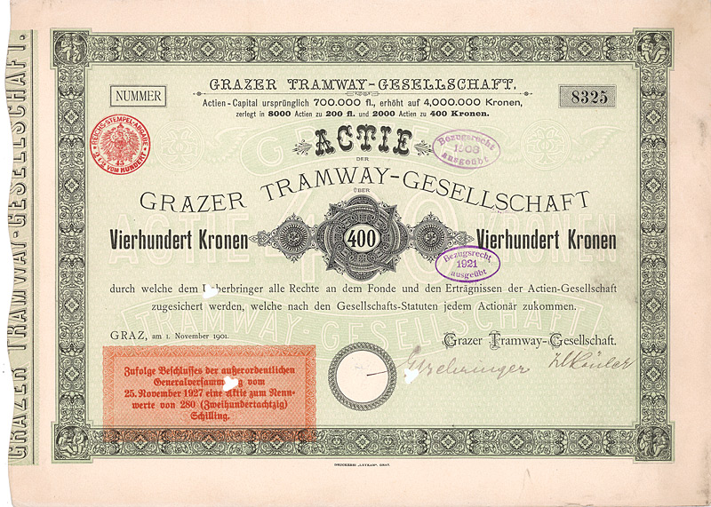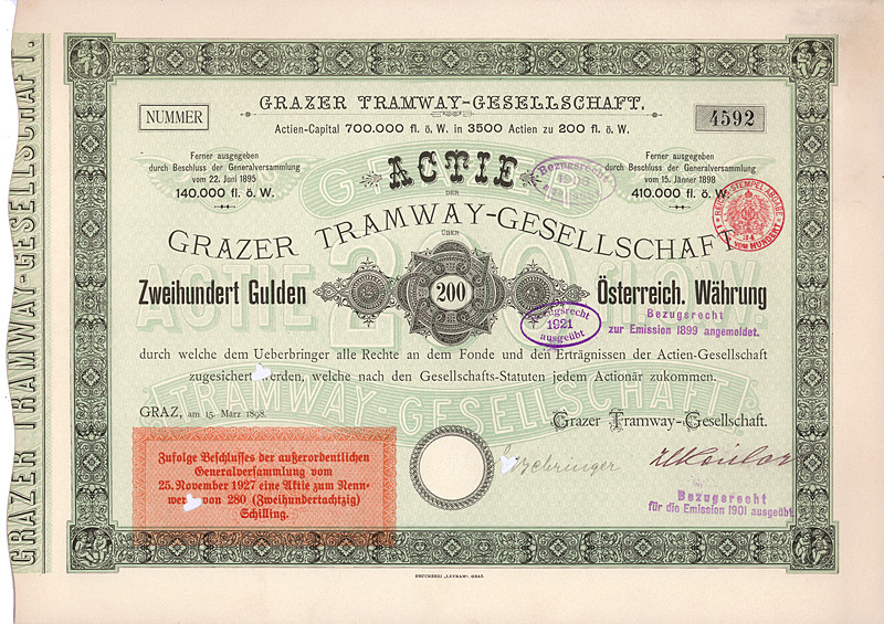 Auflage 2.050, D/H OEL 2071, R8. Am 15.4.1878 erhielt das eigens gegründete Unternehmen Grazer Tramway (GT) eine Konzession zum Bau und Betrieb einer normalspurigen Pferdestraßenbahn vom Südbahnhof zum Geidorfplatz. Da der Gründer der GT am 26.1.1885 verstarb und sich seine Erben und die Stadtgemeinde nicht über einen Verkauf an die Stadtverwaltung einigen konnte, ging das Unternehmen an ein deutsches Konsortium, das eine neue Betreibergesellschaft, die Grazer Tramway Gesellschaft (GTG), gründete. Das Netz wurde immer weiter ausgebaut, die Elektrifizierungsarbeiten begannen 1898 auf dem gesamten Streckennetz. Der zunehmende Individualverkehr führte ab den 1950er Jahren zu sogenannten “autogerechten Verkehrslösungen”, Gleiskörper wurden überpflastert. 1971 wurden bis auf neun Streckenabschnitte der Betrieb eingestellt. Mit Putti in allen vier Ecken. Originalunterschriften. Maße: 27 x 37,5 cm. Doppelblatt, lochentwertet. Sehr seltenes Papier, äußerst günstig angeboten!