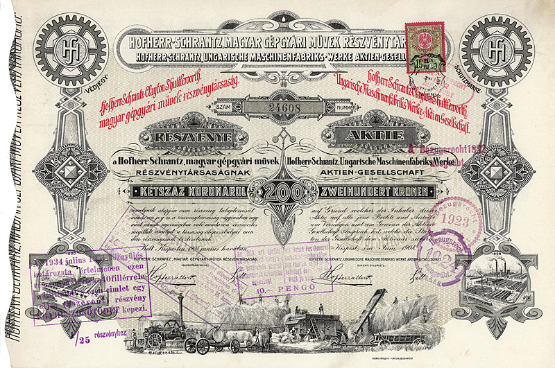 Gründeraktie. Gründung 1908 durch die Niederösterreichische Escompte-Gesellschaft zur Übernahme einer bereits 1857 gegründeten landwirtschaftlichen Maschinenfabrik und Eisengießerei in Kispest. 1912 Erwerb der ungarischen Anlagen der Clayton-Shuttleworth und Umbenennung in Hofherr-Schrantz-Clayton-Shuttleworth Landwirtschaftliche Maschinen-Fabrik AG. In den Fabriken produzierten 1500 Arbeiter alle Arten landw. Maschinen, Rohöltraktoren, Dampfmaschinen und -lokomobile, Dreschmaschinen, Benzin- und Sauggasmotoren, Bewässerungsanlagen, Mühleneinrichtungen und Müllereimaschinen. Börsennotiz in Wien 1935 eingestellt, in Budapest ab 1943 wieder notiert. Nach dem Krieg verstaatlicht. Großformatig und ausgesprochen dekorativ, Fabrikabb., Szenen von der Getreideernte und Dampflokomobil in der Umrandung. Zweisprachig ungarisch/deutsch. Maße: 26,1 x 38,5 cm. Doppelblatt, mit beiliegendem restlichen Kuponbogen.