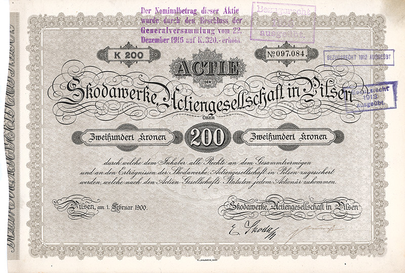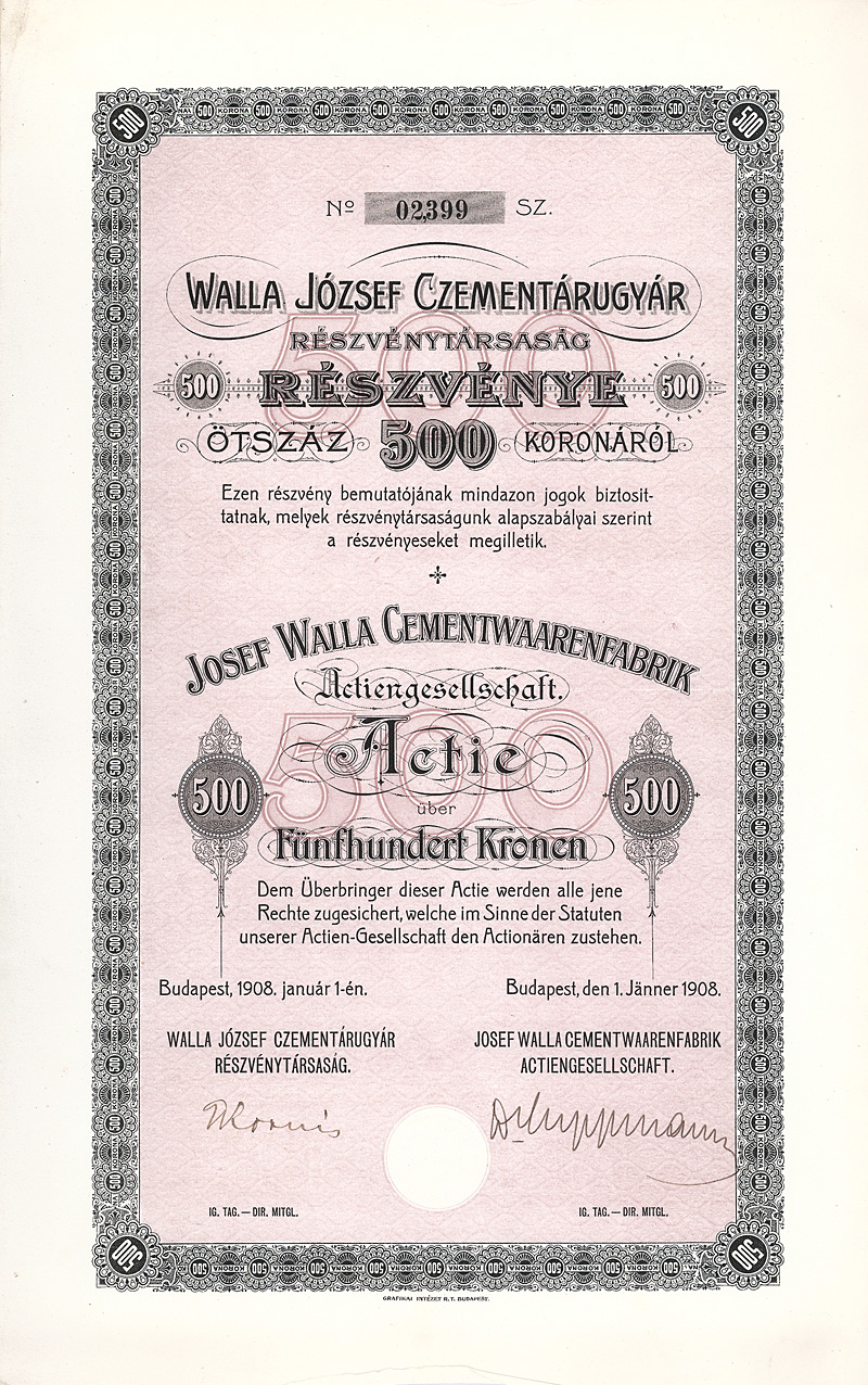 Gründeraktie, Auflage 2.000. Gründung am 21.12.1908 mit einem Kapital von 1 Mio. Kronen. 1918 umbenannt in Josef Walla jun. Cementwarenfabrik AG. Beschäftigt wurden 300 bis 350 Arbeiter. Die Firma bestand noch bis nach dem Zweiten Weltkrieg. Zweisprachig ungarisch/deutsch. Großformatiges Papier, recht dekorativ verziert. Originalsignaturen des Grafen Károly Kornis als Präsident und Dr. Frigyes Lippmann (leitender Direktor). Maße: 41,4 x 26 cm. Doppelblatt, mit restlichem Kuponbogen. Nicht entwertet.