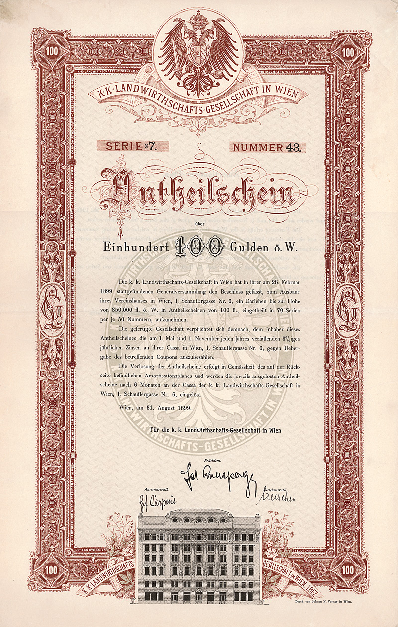 Auflage 3.500. Nach englischem und deutschen Vorbild entstanden auch in Österreich ab der 2. Hälfte des 18. Jh. Vereinigungen des adeligen Großgrundbesitzes und Interessenvertretungen, die sich auch dem landwirtschaftlichen Versuchs-, Publikations- und Unterrichtswesen widmeten. Die wichtigste davon war die 1807 gegründete k.k. Landwirthschafts-Gesellschaft in Wien, um deren Gründung sich u.a. der große österreichische Agrarwissenschaftler Peter Jordan (1751-1827) Verdienste erwarb. Die Ges. wurde 1938 aufgelöst. Aufgenommen zum Ausbau des Vereinshauses in Wien, Schauflergasse 6. Sehr dekorativer, großformatiger Druck, große Gebäude-Vignette und Doppeladler-Wappen. Maße: 46 x 28,9 cm. Doppelblatt, mit Kuponbogen. Zwei kleine Randeinrisse hinterklebt.