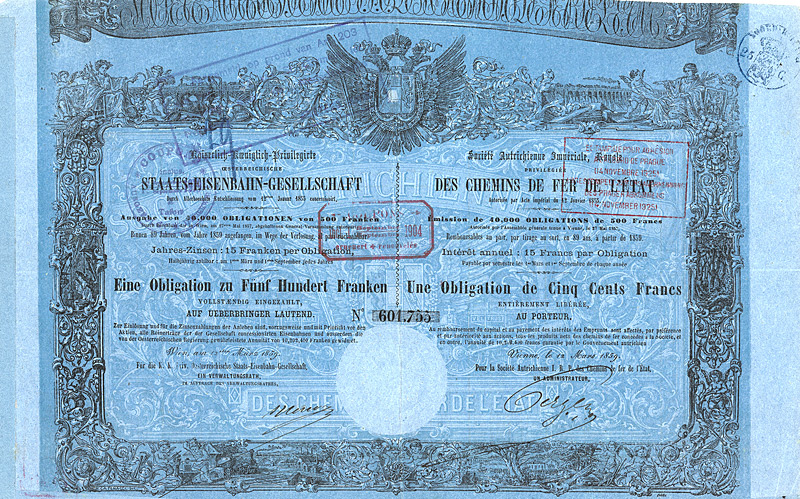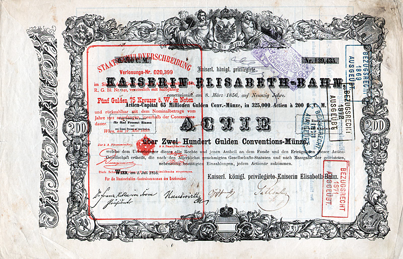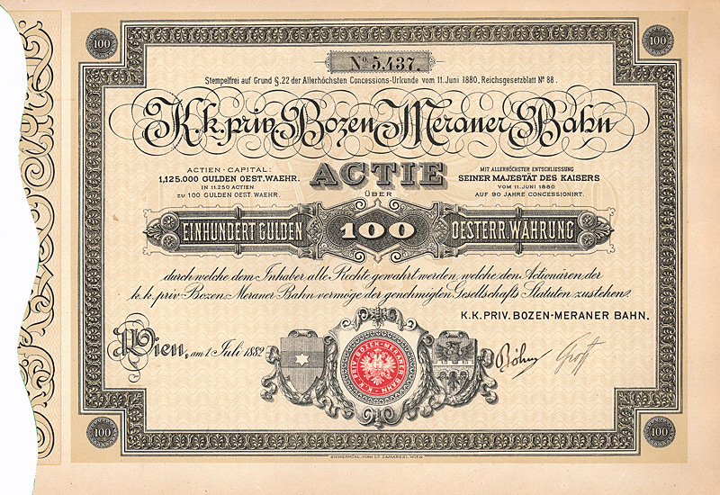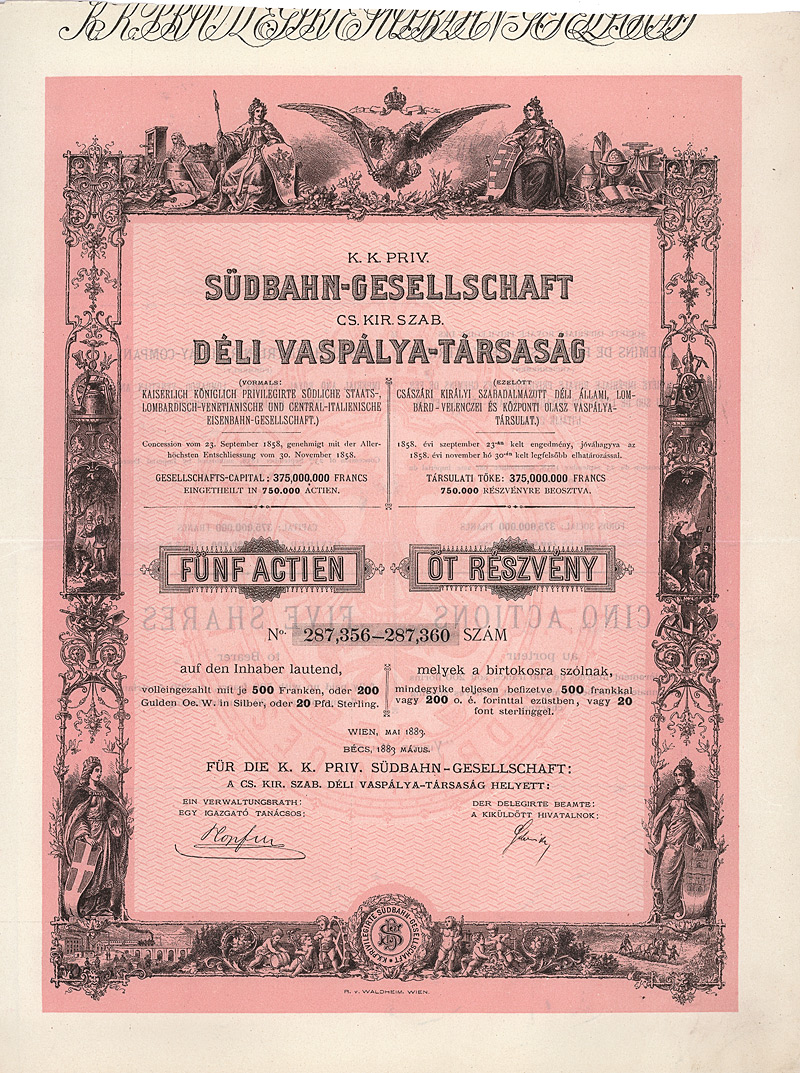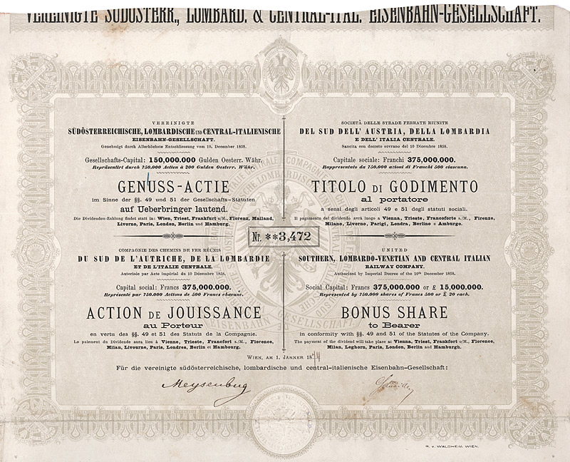 Konzessioniert wurde die Südbahn-Gesellschaft im Jahr 1858. Mit einem Streckennetz von fast 1.000 km war sie eine der bedeutendsten Eisenbahnen der Monarchie. Hauptbahnen: Wien-Triest (250 km), Bleiburg-Weitlanbrunn (221 km) und Kufstein-Brenner (110 km). Die politischen Veränderungen nach dem 1. Weltkrieg führten dazu, daß das Bahngebiet nun auf dem Territorium von 5 Staaten lag: Österreich, Königreich der Serben, Kroaten und Slovenen, Ungarn, Italien und Freistaat Fiume. Mit allen diesen Staaten schloß die Südbahn neue Verträge und überlebte deshalb sogar die Zerschlagung der Donaumonarchie. Ausgegeben wurden die Genuss-Actien zu Beginn eines jeden Jahres nach Auslosung einer dann durch Nennwertrückzahlung getilgten Actie à 200 Gulden. Viersprachig deutsch/italienisch/französisch/englisch. Maße: 25,2 x 31,5 cm. Mit komplett anhängenden Kupons. Prägesiegel unnötigerweise teils hinterklebt.