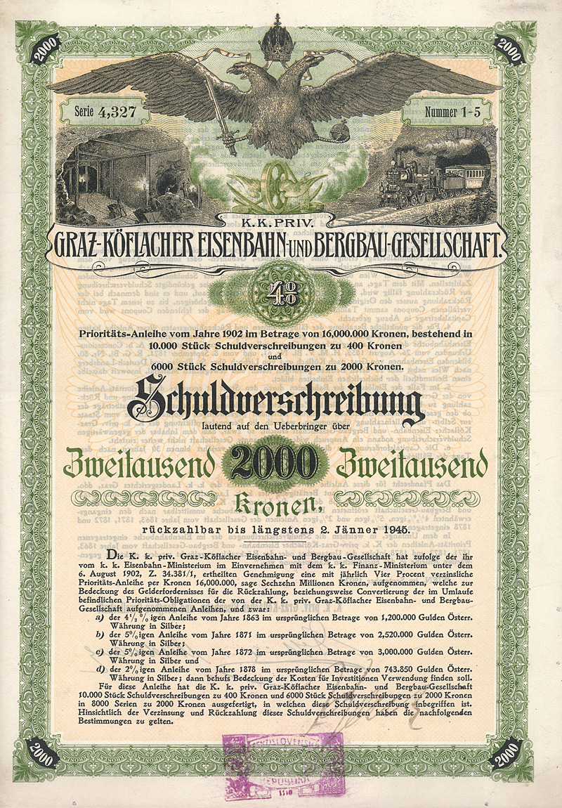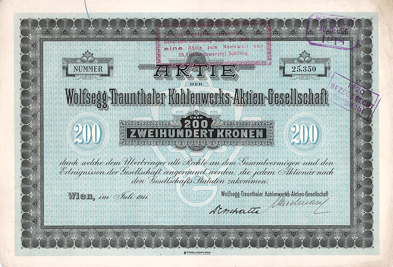 Gründeraktie, Auflage 30.000. Gegründet am 17.7.1911. Zur Vorgeschichte: Ende des 18. Jahrhundert wurde mit dem Abbau von Braunkohle im Hausruck begonnen. 1839 gründete Baron Rothschild die “Traunthaler Gewerkschaft”, welche den Kohlenabbau in Thomasroith betrieb. 1843 gründete Graf Saint Julien die “Wolfsegger Gewerkschaft”. Beide Gewerkschaften bauten Bahnlinien von Wolfsegg-Kohlgrube nach Breitenschützing und von Thomasroith nach Attnang. 1855 erhielten die Grafen Saint Julien, Alois Miesbach und Baron Rothschild die Bewilligung zur Gründung einer Aktiengesellschaft mit der Bezeichnung “Wolfsegg-Traunthaler Kohlenwerks- und Eisenbahngesellschaft”. 1870 erwarb die WTK den Bergbau des Grafen Arco (Windischhub, Hausruckedt und Eberschwang) und somit war de facto der gesamte Bergbau im Hausruck in den Händen der WTK. 1911 ging das Unternehmen aus dem Werndlschen und Aichingerschen Familienbesitz in ein Konsortium über, das aus mehreren Banken und Industriellen bestand, angeführt von der Unionbank und der Firma Beer, Sondheimer & Co. in Frankfurt am Main. Es erhielt den Namen “Wolfsegg-Traunthaler Kohlenwerks Aktien-Gesellschaft”. Nach mehreren Eigentümerwechsel beteiligte sich 1919 das Land Oberösterreich und der Staat Österreich an der WTK AG. 1924 Ausbau der Kleinbahn Ampflwang-Timelkam zu einer regelspurigen Kohlenschleppbahn. In den Jahren 1955, 1963 und 1964 wurden jeweils über eine Million Tonnen an Braunkohle gefördert. Ab Mitte der 1920er Jahre wurde der Großteil der geförderten Braunkohle im 18 Kilometer entfernten neuerrichteten Kraftwerk Timelkam verfeuert. 1946 wurde das Unternehmen verstaatlicht. Nachdem 1992 die Stilllegung beschlossen wurde, stellte man 1995 den Bergbau ein. 1996 wurde der Betrieb an Privat verkauft, die in geringe Mengen tagbaumäßig Hausbrandkohle (3,5 t) abbaute und zu Briketts verarbeitet. Heute werden etwa die Anlagen in Wolfsegg-Kohlgrube als Industriedenkmal und Veranstaltungsort genutzt. Maße: 23,2 x 34,2 cm. Doppelblatt. Einzelstück aus der Auflösung einer uralten Sammlung. Bedeutendes Papier, extrem günstig angeboten!