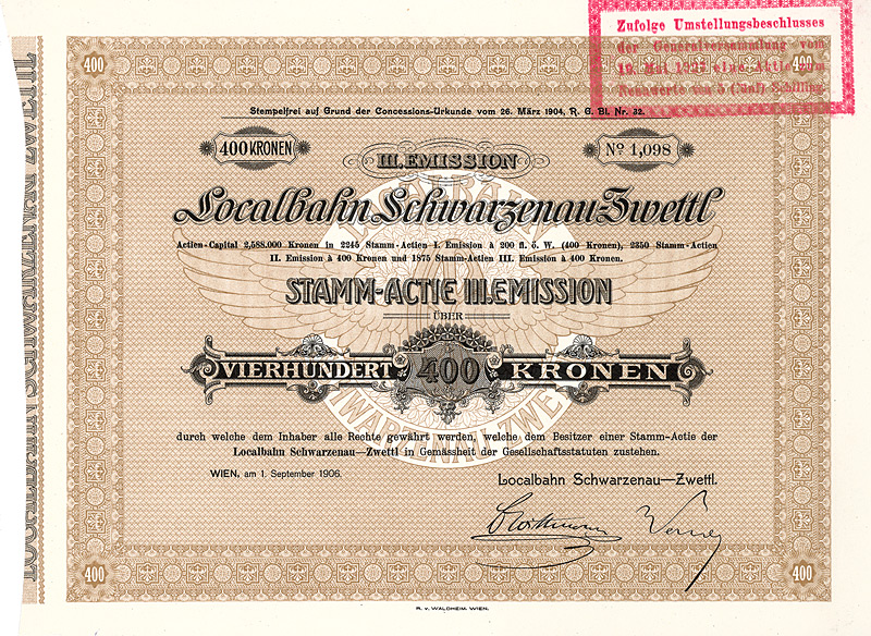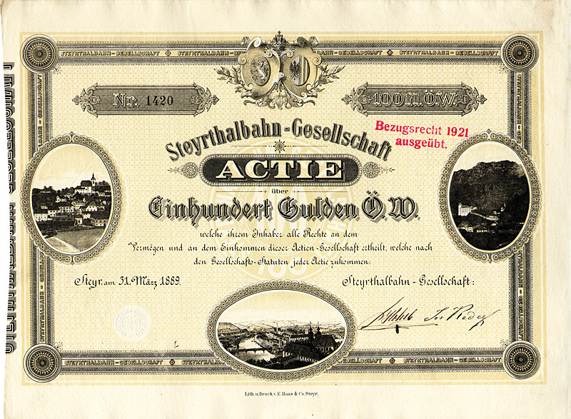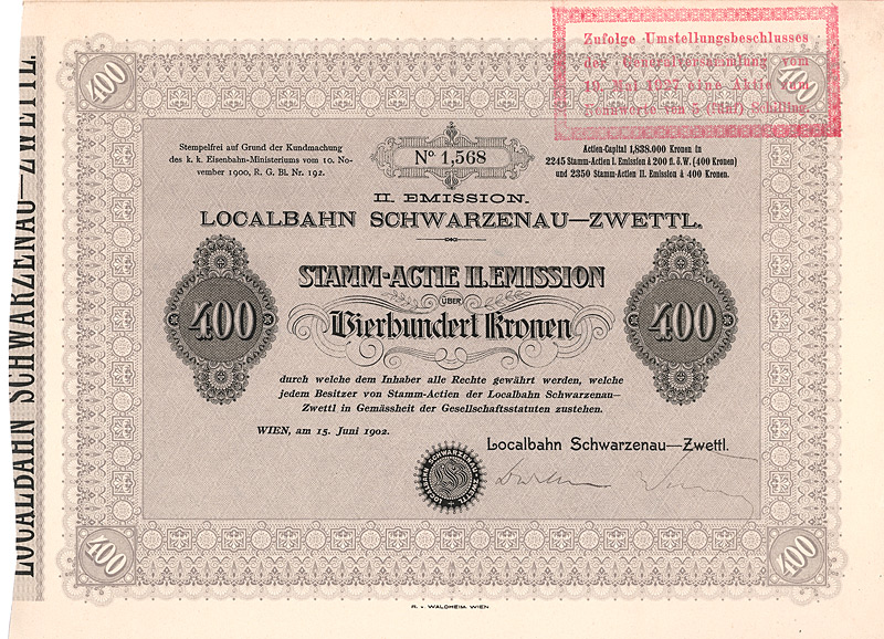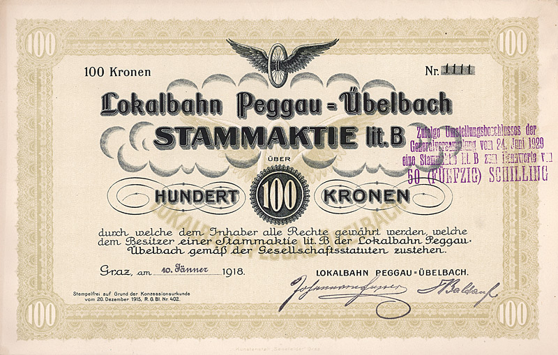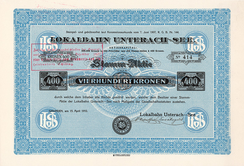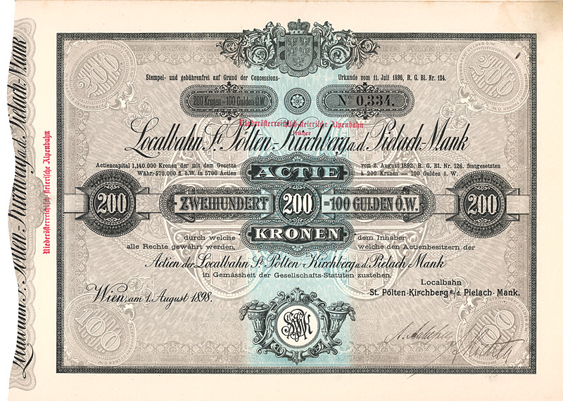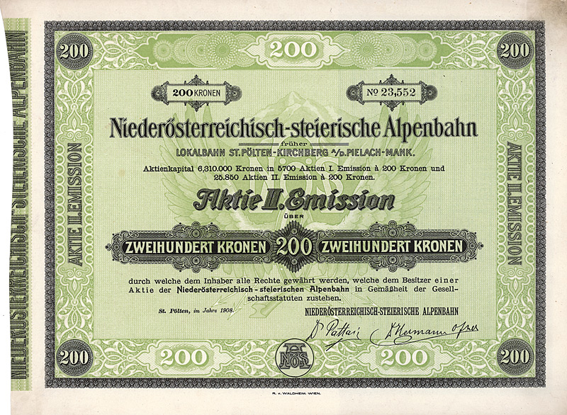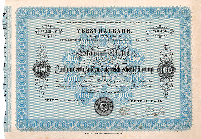 Gründeraktie, Auflage 5.500, D/H OEL 2538, R 9. Bereits um 1870 gab es Pläne für eine Bahnlinie durch das Tal der Ybbs, die aber der Wiener Börsenkrach 1873 zunichte machte. Erst 1895 wurde mit dem Bau der Bahn 71 km langen 760-mm-Schmalspurbahn (Bosnische Spurweite) in Waidhofen begonnen, 1898 war die Bahn bis Kienberg-Gaming durchgängig befahrbar (außerdem 6 km lange Zweigbahn Gstadt-Ybbsitz). Durch den Bahnbau blühte die Industrie auf, allen voran die Böhlerstahlwerke. Bis Lunz am See (Kilometer 53,6) bis heute im Betrieb der ÖBB. Die technisch anspruchsvolle Bergstrecke von Lunz am See nach Kienberg-Gaming wurde 1988 eingestellt, aber 1990 von einem Verein als Museumsbahn übernommen, die mit ihren Dampfbummelzügen jetzt zahllose Touristen anlockt. Maße: 23,2 x 33,1 cm. Doppelblatt. Sehr seltenes Stück in einem sehr guten Erhaltungszustand, extrem günstig angeboten!