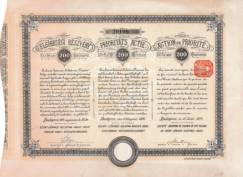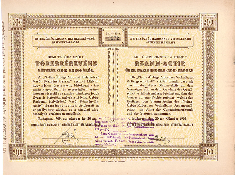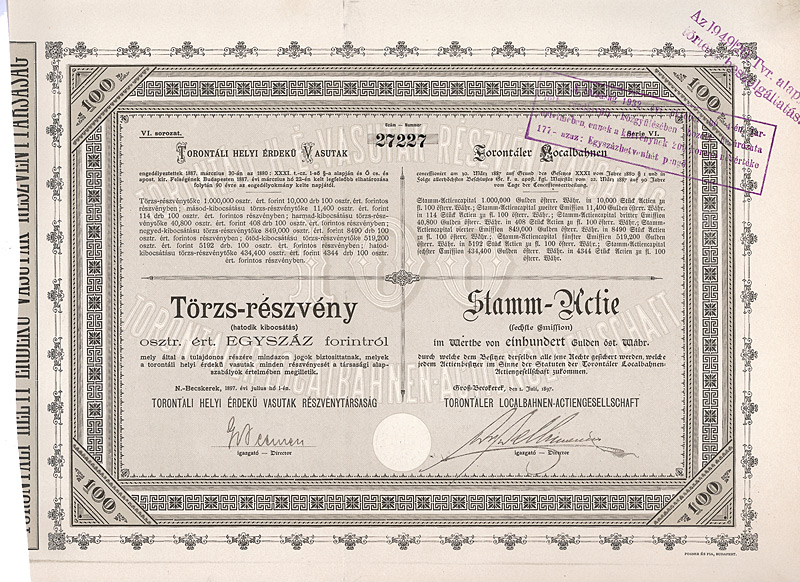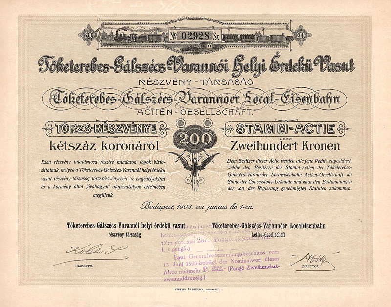 Gründeraktie, Auflage 3.824. Gründung am 6.5.1903, Strecke Töketerbes - Varannó, 30,473 km, eröffnet am 24.12.1903. Zweisprachig ungarisch/deutsch. Dekorative Gestaltung mit Eisenbahn-Vignette und geflügeltem Rad. Originalsignaturen. Maße: 23,5 x 30, 2 cm. Doppelblatt, mit beiliegendendem kompletten Kuponbogen. Äußerst selten, sehr niedrig limitiert!