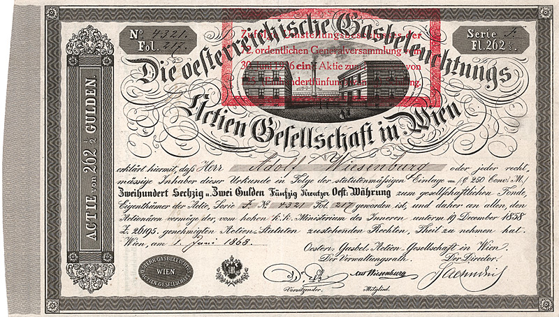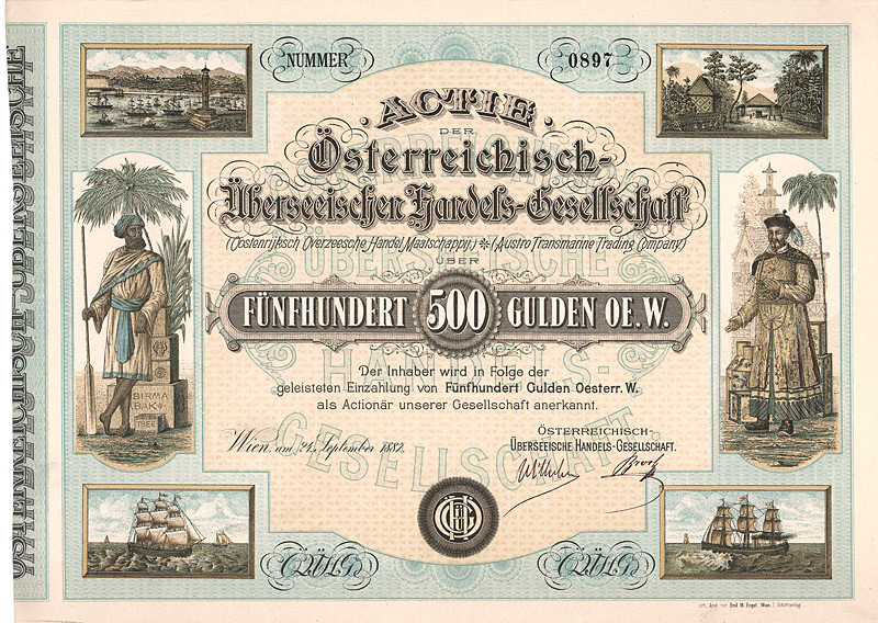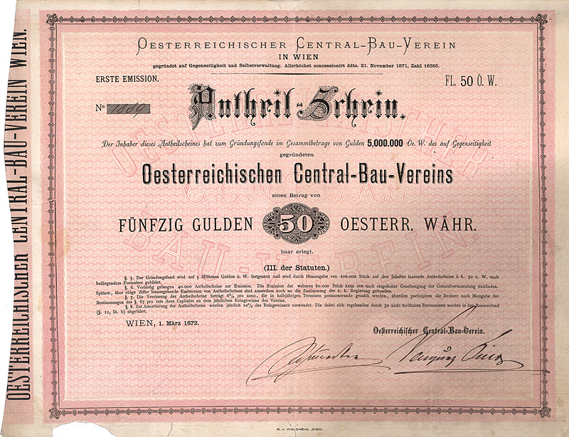 Gründeraktie (Interims-Schein). Die Wiener Wechsler-Bank hat ihre Tätigkeit am 1.7.1869 begonnen. Mit diesem Tage ist das Bank- und Wechslergeschäft der Firma “A. Mayer & Cie.” mit allen Activen und Passiven an die Anstalt übergegangen. Das Kapital betrug 5 Mio. Gulden, eingezahlt mit 40 %. Mit der unmittelbaren Leitung der Geschäfte war das Directionsmitglied Herr Hugo Schück betraut, welchem der vorherige Chef des vorgenannten Bankhauses, Herr A. Mayer zur Seite stand. Das Bankgebäude befand sich Graben 6 in Wien. Präsident war Friedrich Graf Hartig, Vice-Präsident Constantin Graf Gatterburg. Nachdem die Geschäfte im Jahr 1871 ausserordentlich gut liefen, beschloss die Ausserordentliche GV am 21.12.1871 die Vergrößerung des Gesellschafts-Kapitals zur Höhe von 10 Mio Gulden. Zunächst mit 40% = 80 Gulden eingezahlt. Dann wurden nochmals 80 Gulden gezahlt. Das Bezugsrecht wurde im Dezember 1872 ausgeübt. Dekorativ, teils in Silber gedruckt. Mit Originalunterschriften. Maße: 25 x 39,2 cm. Doppelblatt, mit beiliegendem restlichen Kuponbogen (Kupons ab 1873). Sehr seltenes Papier, außerordentlich günstig angeboten!