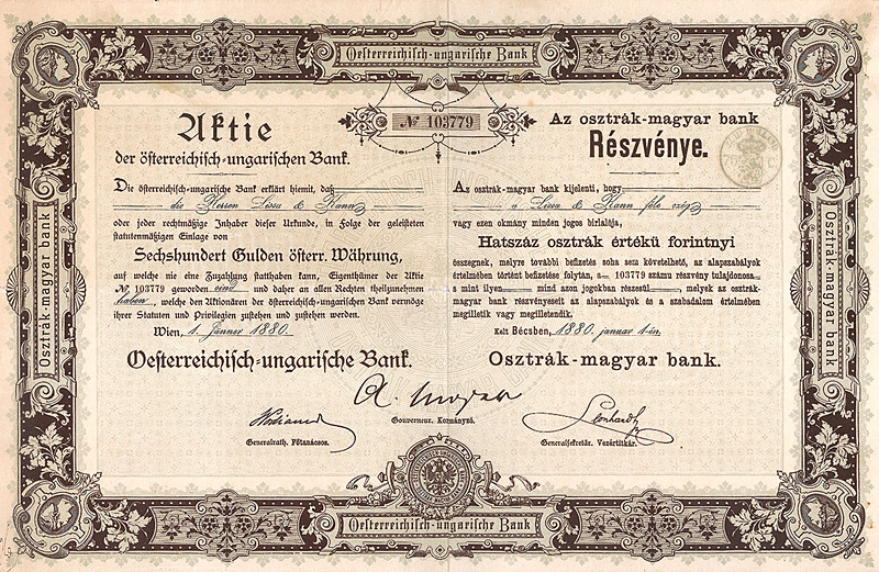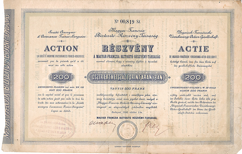 Auflage 20.000. Gründung 1879 durch die “Union-Generale” in Paris. Die Ges. erwarb sämtliche Aktien des Österreichischen Phönix. Fast alle Zweige der Versicherung wurden betrieben: Feuer-, Transport-, Hagel-, Unfall- und Lebensversicherung. 1889 wurde das Transport-Versicherungsgeschäft an die Düsseldorfer Transport-Versicherungs-Ges. übertragen. 1921 ging das neurumänische Geschäft der Ges. an die neugegründete Franco-Romana Allg. Versicherungs AG, das jugoslavische an die Jugoslavija Allg. Versicherung in Belgrad und 1923 das cechoslovakische an die Merkur cechoslov.-französische Versicherung in Prag über. 1937 fusionierte die Ges. mit der Fonciere Allg. Versicherungs-Anstalt, Budapest. Dreisprachig französisch/ungarisch/deutsch, Wappen im Unterdruck, Originalunterschriften. Maße: 22,9 x 35,5 cm. Rückseitig Statuten. Mit anhängenden restlichen Kupons ab 1889.