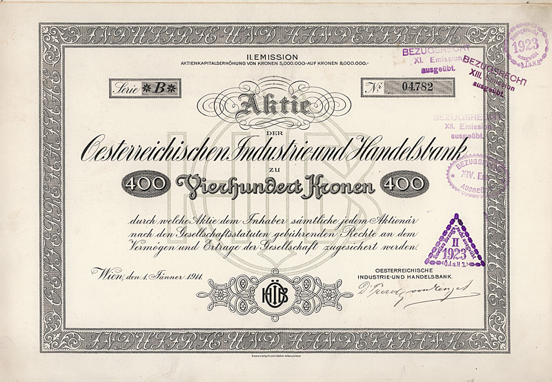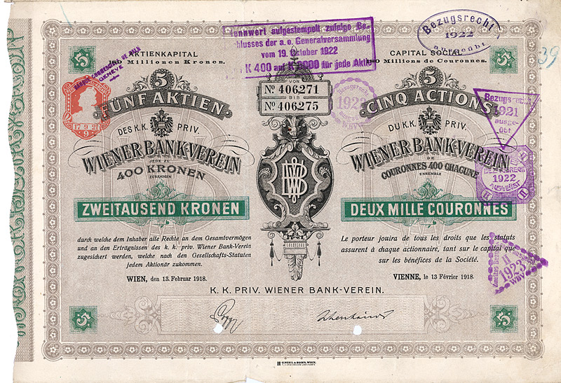 Auflage 3.750. Gründung am 11.9.1916 in Wien. Die Bank errichtete in Karlsbad eine Filiale, die insbesondere in der nordböhmischen Porzellanindustrie ausgedehnte Klientel fand. Im Herbst 1921 trat die Bank in den Interessenkreis der Anglo-Austrian Bank und der dieser nahestehenden Biedermann Bank ein, die einen namhaften Aktienposten des Instituts erwarben. Ein Stück aus der ersten Kapitalerhöhung. Maße: 25 x 35,4 cm. Doppelblatt, mit Restkupons ab 1923. Einzelstück aus der Auflösung einer uralten Sammlung, sehr günstig angeboten!