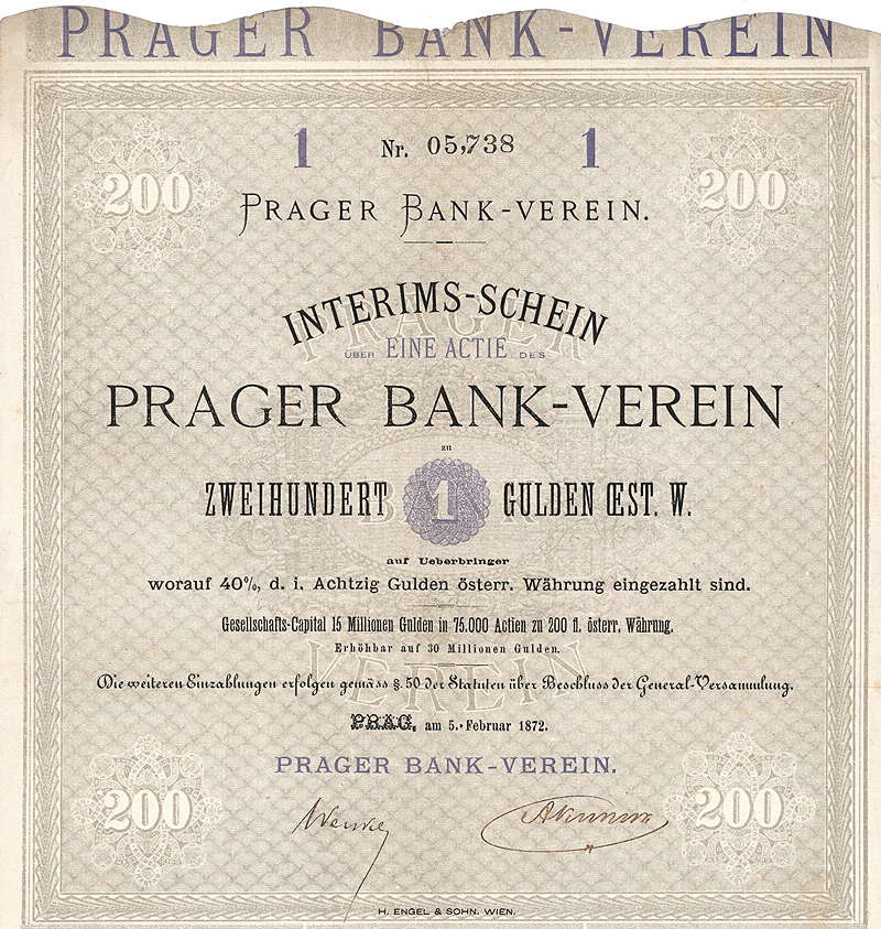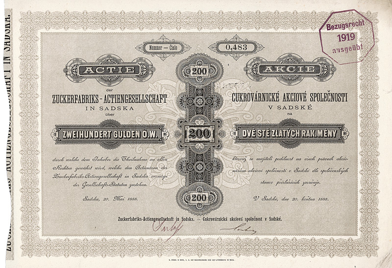 Gründeraktie, Auflage 2.000. Gründer war die Anglobank. Rohzuckerfabrik 40 km östlich von Prag. Zweisprachig deutsch/tschechisch. Maße: 24,2 x 34,5 cm. Doppelblatt. Originalsignaturen.