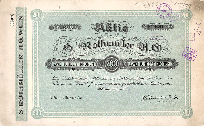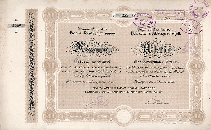 Auflage 5.000. Gründung am 17.4.1910 unter der Firma Ungarisch-Amerikanische Holzbearbeitungs-Musteranlage AG, im März 1917 umbenannt wie oben. In den Fabriken der Ges. wurden Massenmöbeln hergestellt. Die Firma gehörte dem Interessenkreis der Hermes Wechselstuben AG. Zweisprachig ungarisch/deutsch. Maße: 26 x 41,7 cm. Doppeblatt, mit restlichen Kupons. Nicht entwertet.