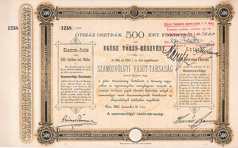 6. Emission, Auflage 4.344. Gründug 1887. Acht Strecken mit 347 km Gesamtlänge. Mehrheitsaktionär war der Staat. Zweisprachig ungarisch/deutsch. Originalsignaturen. Maße: 30,1 x 40 cm. Doppelblatt, mit beiliegendem kompletten Kuponbogen. Äußerst seltenes Stück aus alter Sammlung, sehr günstig angeboten!